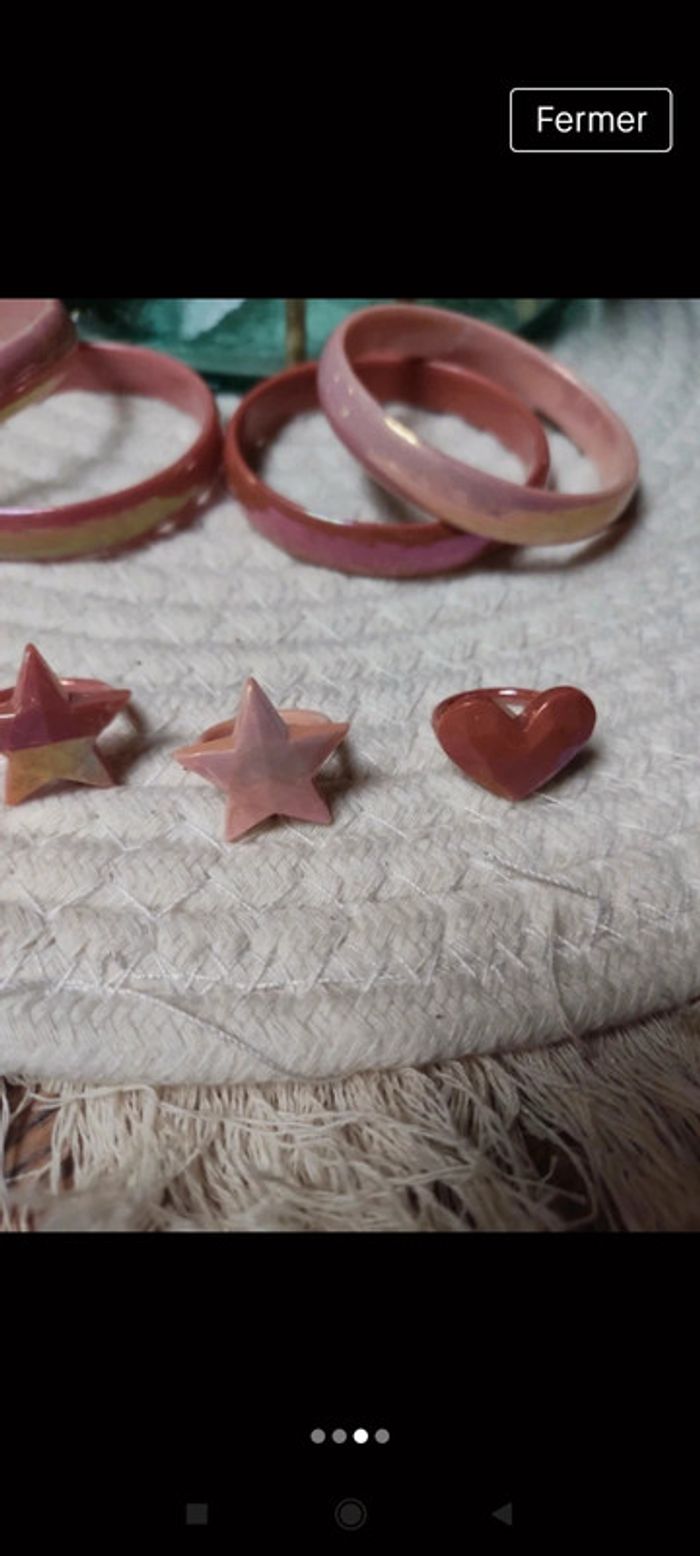 En excellent état. Lot de 8 magnifiques bijoux fille composé de 4 bracelets et 4 bagues coeurs et Étoiles, irisées coloris rose et marron glacé du plus bel effet. ⚠️ Je fais des envois via tous les points relais sauf Colissimo !!! #bijouxfille #braceletsfille #baguefille
