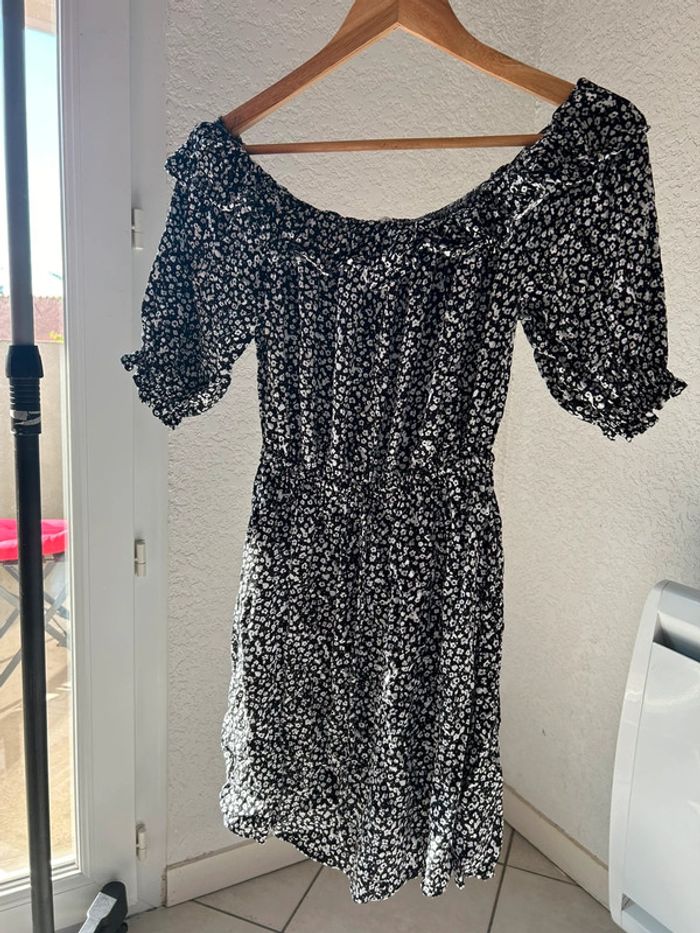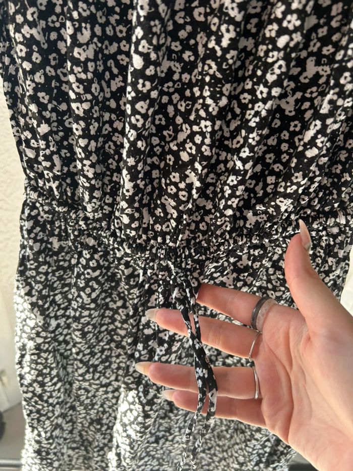 robe à fleurs gemo taille 36 noire et blanche volants au niveau des épaules et ceinture à la taille arrive au niveau des genoux très peu portée