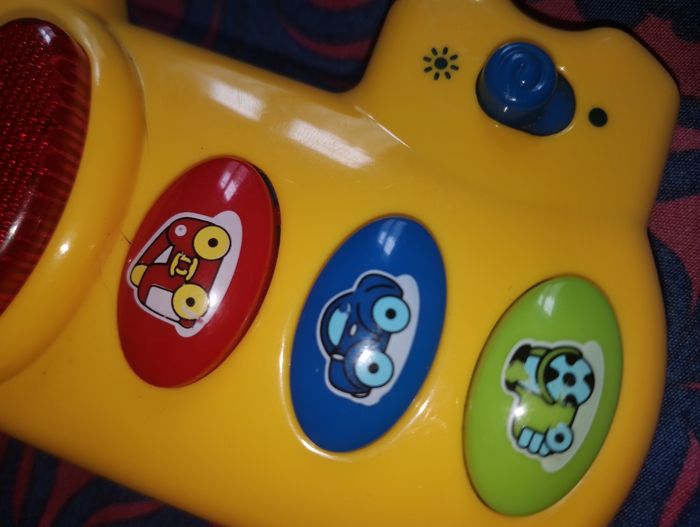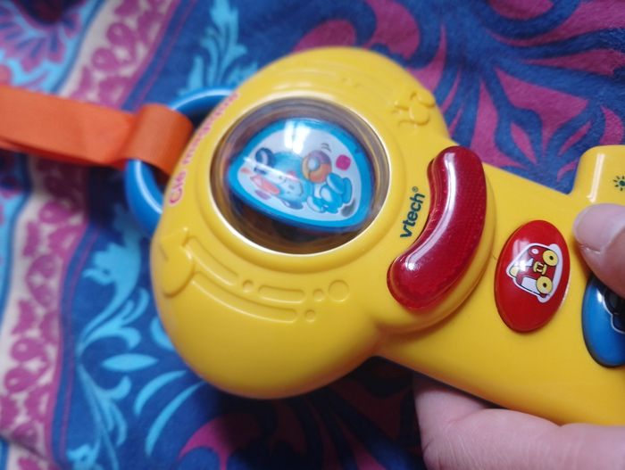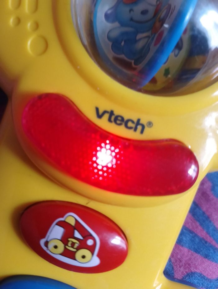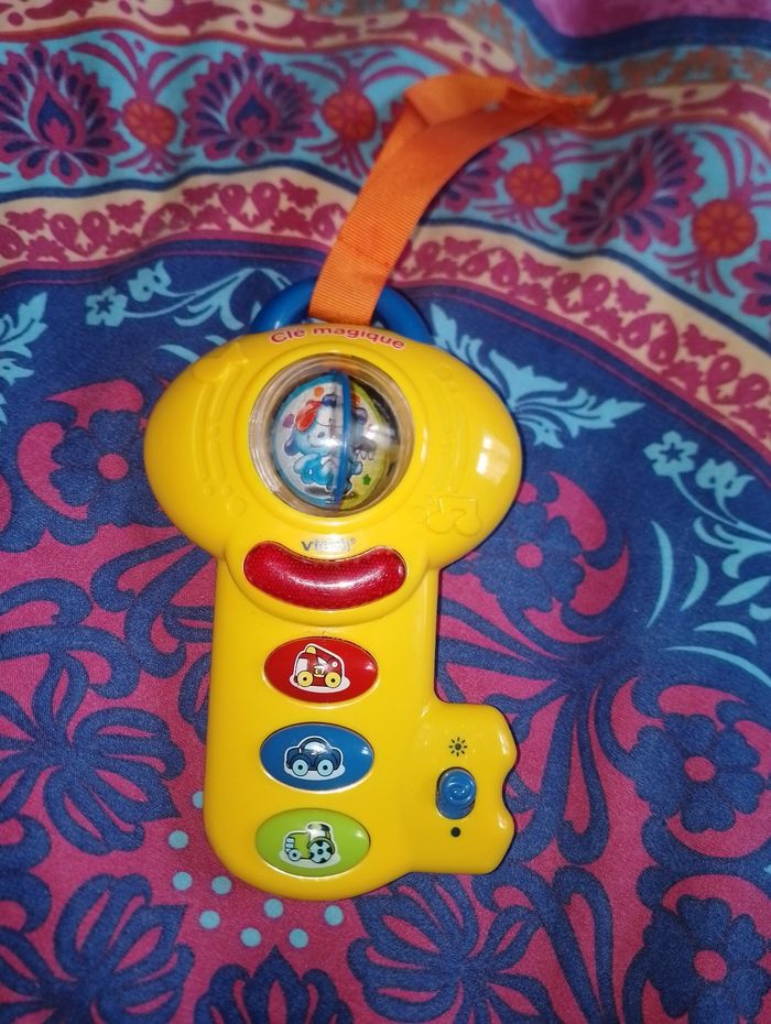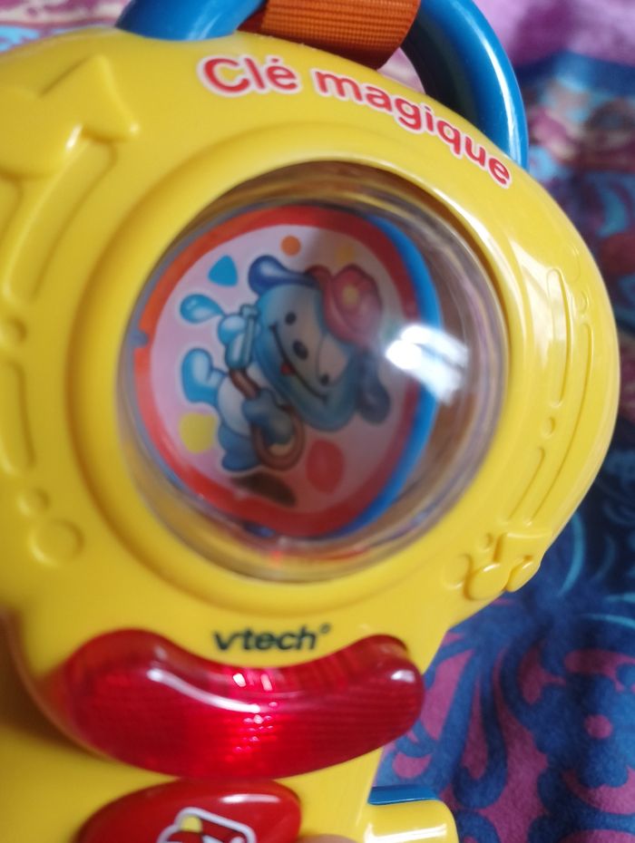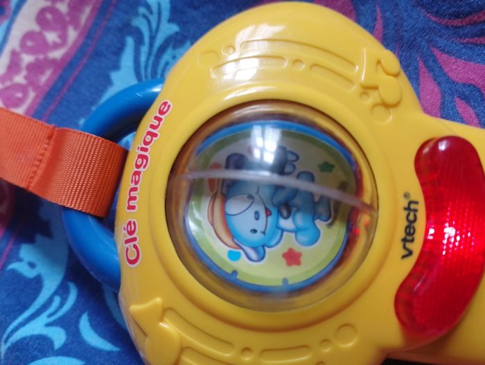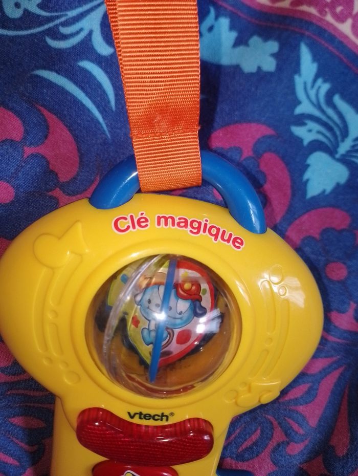 Clé magique de VTech A suspendre Hochet musical. Imite le bruit du tracteur, de la voiture et du camion de pompier. Un bouton qui fait tourner la boule en haut. Un lien orange à scratch pour l'accrocher à la poussette, au parc