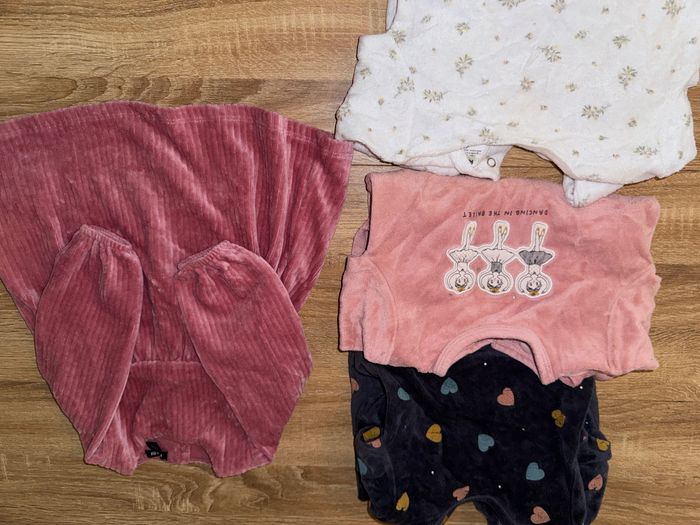Je vends 3 pyjamas en velours pour bébé fille, taille 6 mois en très bon état et la robe taille 6 mois, neuf sans étiquette jamais porté