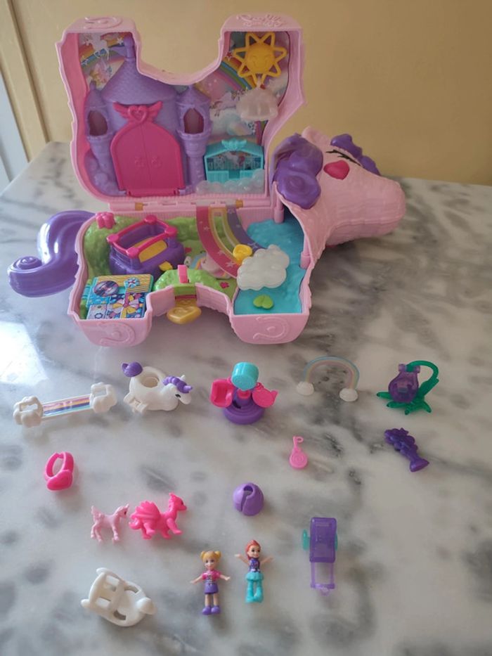 Ce grand coffret en forme de licorne et de piñata est doté d’ailes(manque 1 aile) et d’une poignée pour le transporter facilement . Tirez sur la languette pour ouvrir et découvrir des surprises dans un palais avec comme invi tées d’honneur, les mini-figurines Polly et Lila. . A partir de 4 ans, La plupart des accessoires surprises peuvent se fixer dans le coffret pour les faire tourner ou pour que les mini-figurines les utilisent.Manques quelques surprises mais n'empêche en rien de jouer