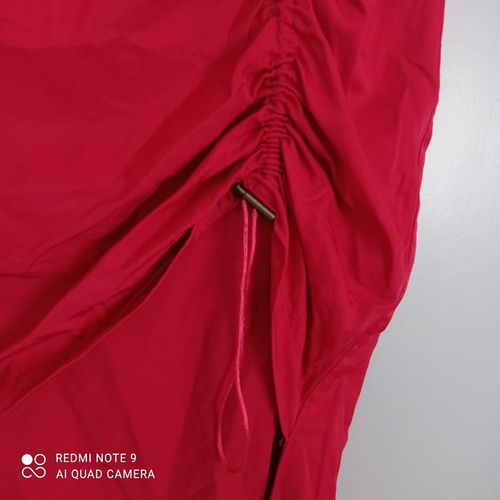Etiquetée t34/36 mais un point de couture pour la resserrer à la taille voir photos. Donc taille plus petit. Voici les mesures prises à plat : largeur à la taille : 31cm, longueur : 81cm. Stylée par le côté asymétrique et le resserrage possible par cordon de côté. C9