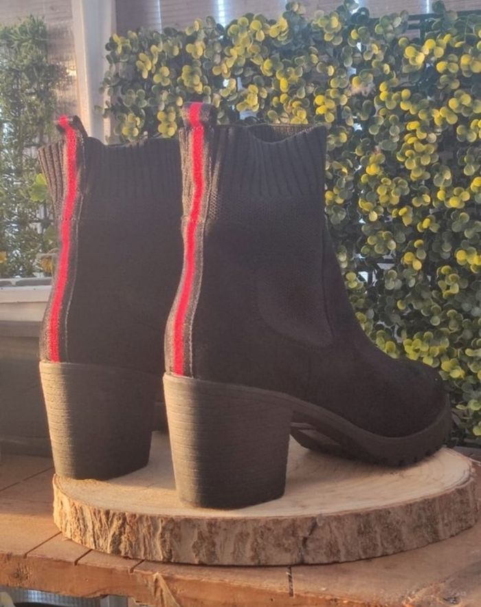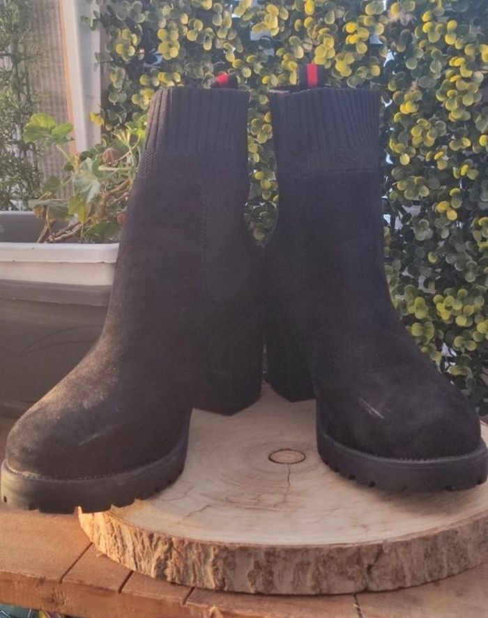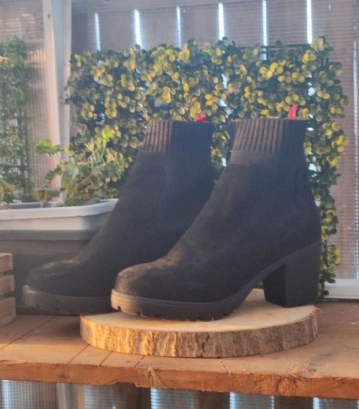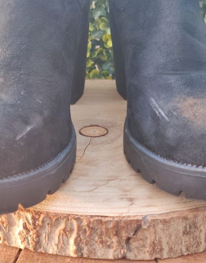 Bottines noires en daim de taille 41. Mis a pars les petites éraflures à l'avant ( entrechoc en marchant) tout et en parfaite état, elles ont étaient très peu porter, prennent plus la poussière qu'autre chose.
