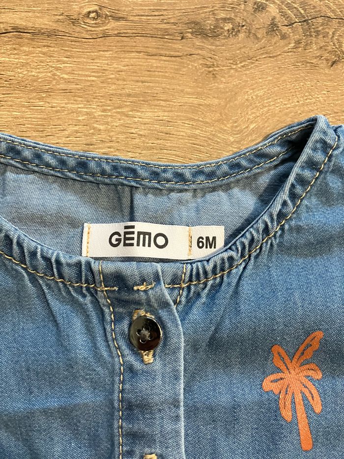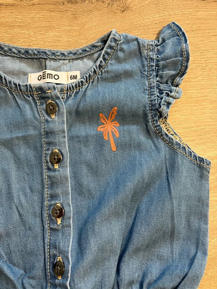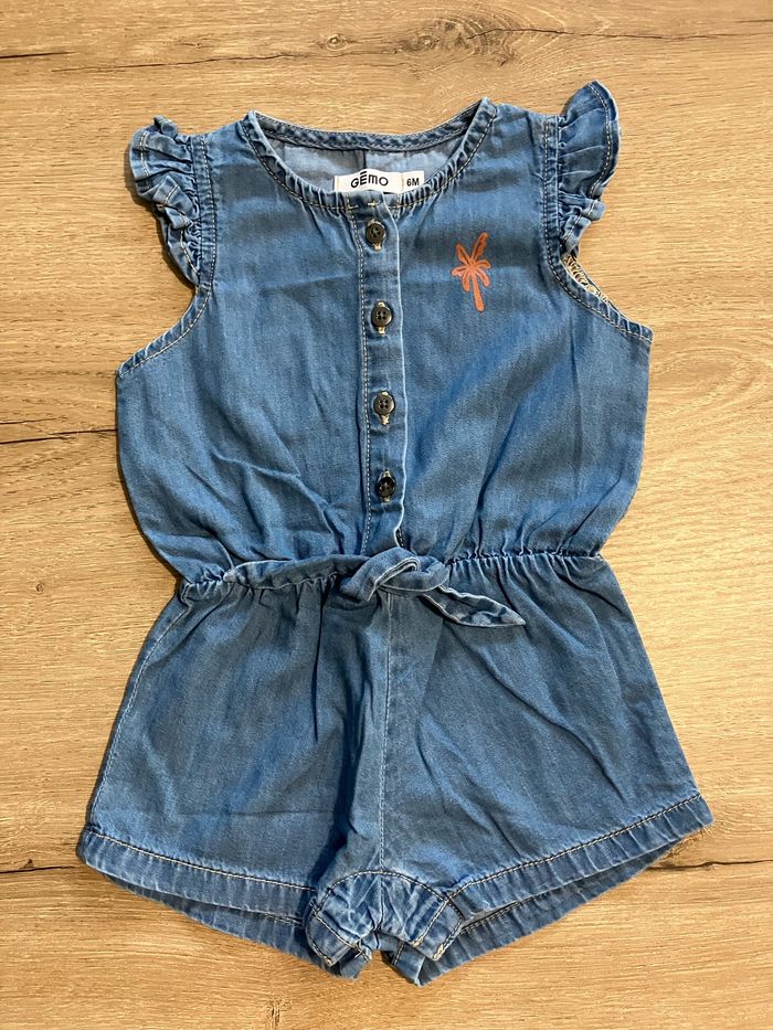 Combinaison short / barboteuse effet jeans à motif palmier Ouverture par boutons pression à l’entrejambe Gémo taille 6 mois Parfait état