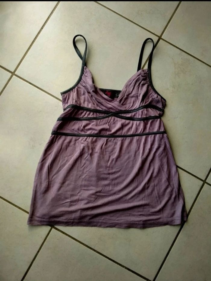Débardeur parme. Jennyfer. Taille 38 Moulant a la poitrine, évasé au niveau du ventre. Petites bretelles. Très bon état. Quelques petite bouloches lorsque l'on regarde de près. Voir photo. 1€50 Envoi par mondial Relay Remise en main propre possible sur Beauregard Vendon Riom ou Clermont Ferrand 63 D'autres articles de cette taille sur #ptitesev63vetement38