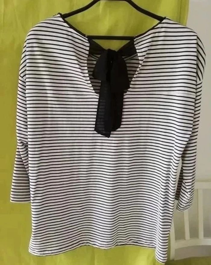 Tee shirt Rayé kiabi Col dentelle noir et nœud dans le dos Taille L manche 3/4 #angelsabinevetementsfemme40