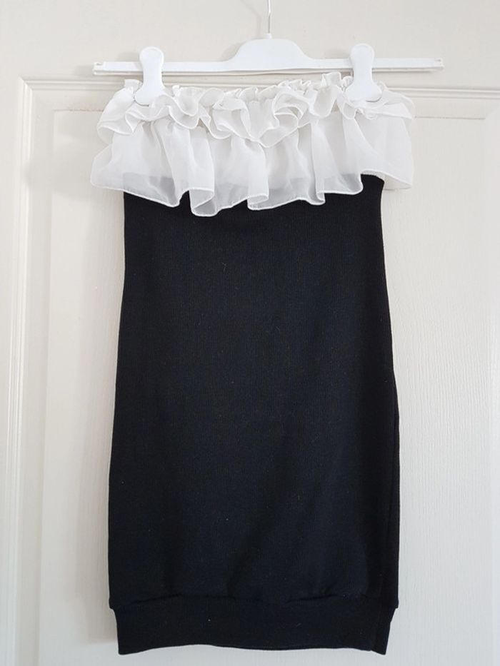Robe noir sans manche. Volant blanc sur la poitrine mais qu'à l'avant. Fermeture sur le côté par un zip. Taille 36. Jamais porté. Pour tout mes autres articles gothique Lolita ⤵️ C'est ici ➡️ #UsagiiChanLolita ✡ #lolita