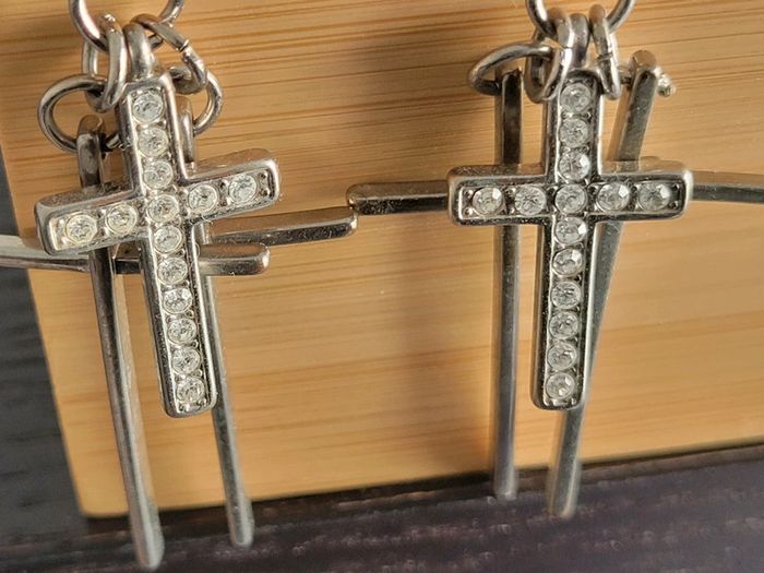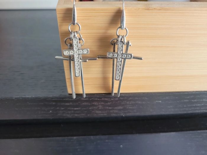 Boucles d'oreilles pendante. 3 croix dont une rempli de mini diamant de synthèse. Véritable argent. Porté quelques fois. Acheté 30€ Pour tout mes autres Bijoux c'est ici : #UsagiiChanBijoux 💍