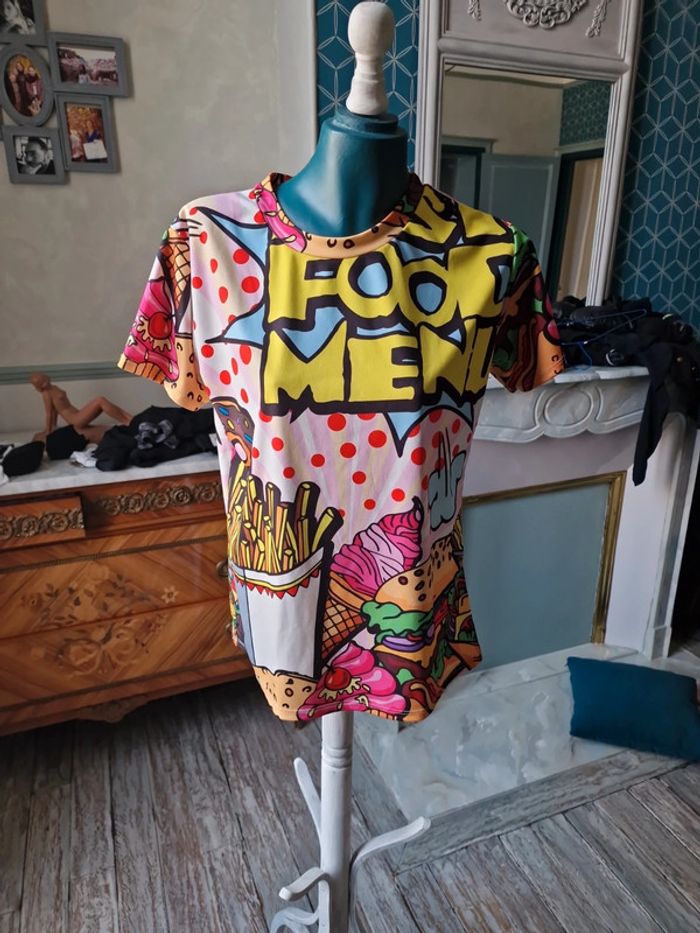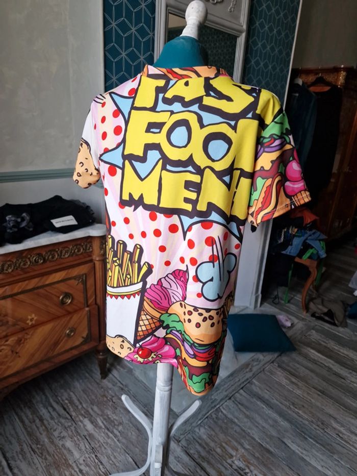 Tee shirt très original Taille 38/40 Dessin burger frites Donut glace 100% polyester Neuf sans étiquette