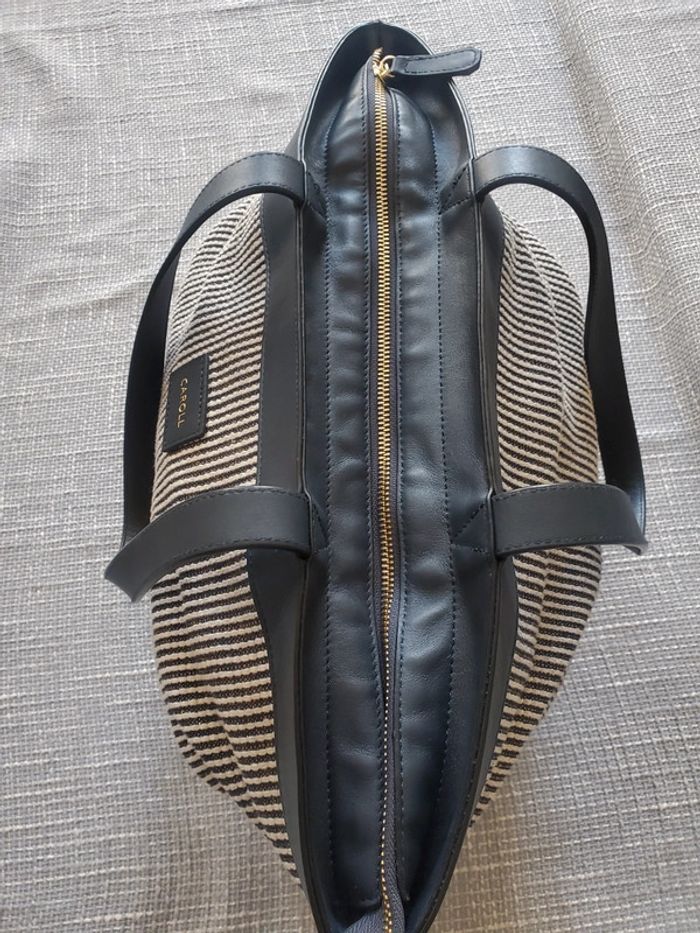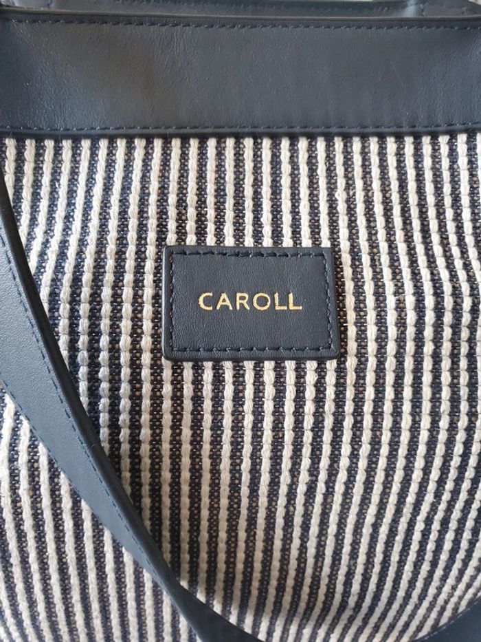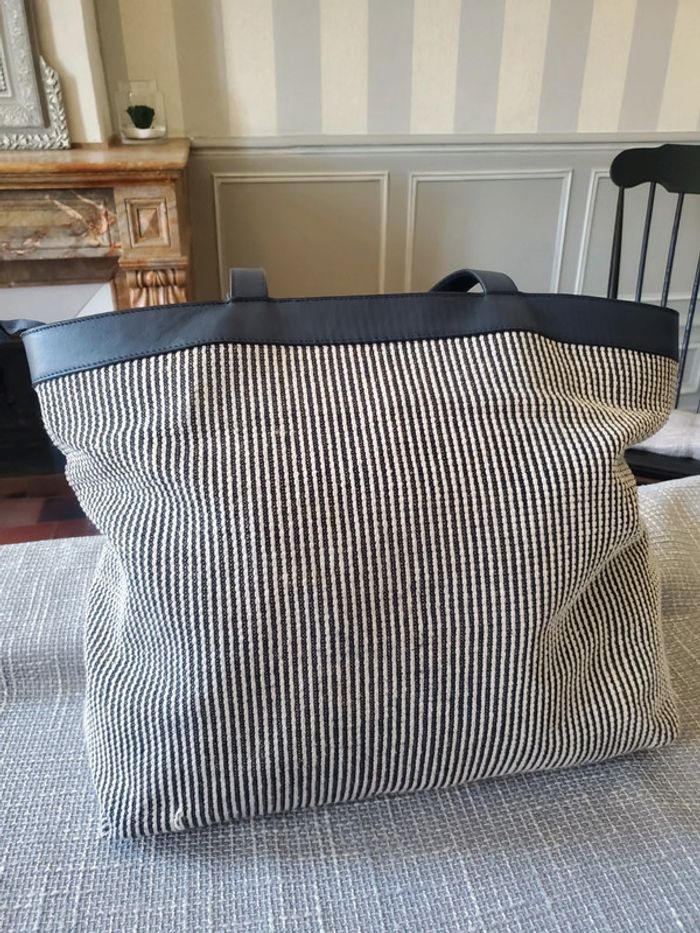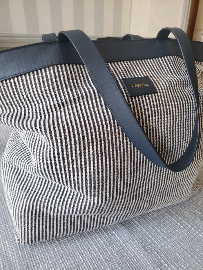 Sac cabas caroll 33 cm en hauteur 46 cm largeur en haut du sac 39 cm largeur en bas du sac 13 cm en profondeur Petit accros au dos du sac Bleu marine et blanc Les réductions sont activées sur les lots