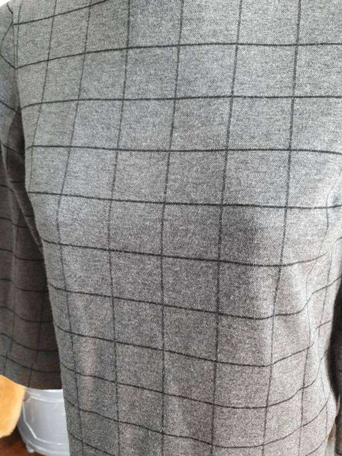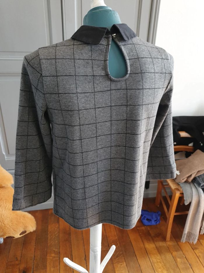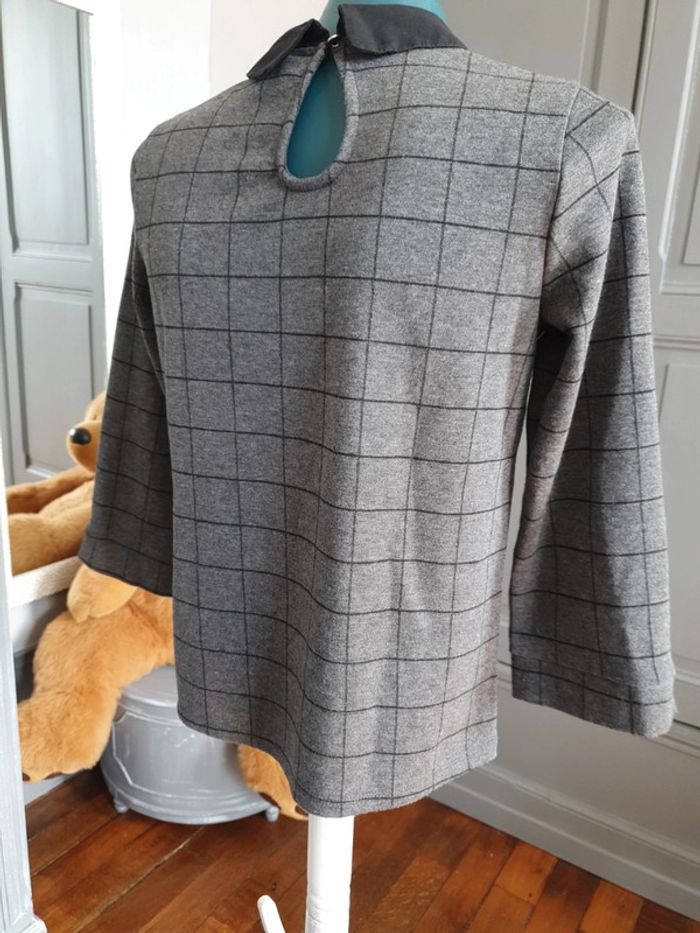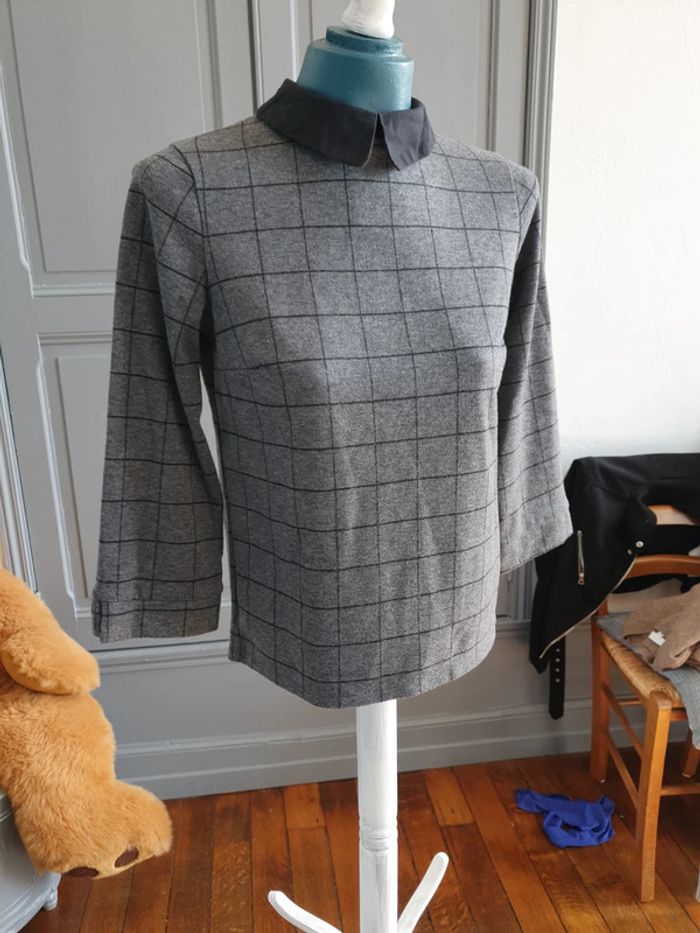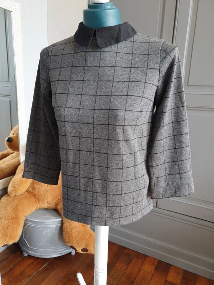 Tee-shirt femme Chemisier Avec col A carreaux Gris et noir Manches 3/4 larges En très bon état Les réductions sont activées sur les lots