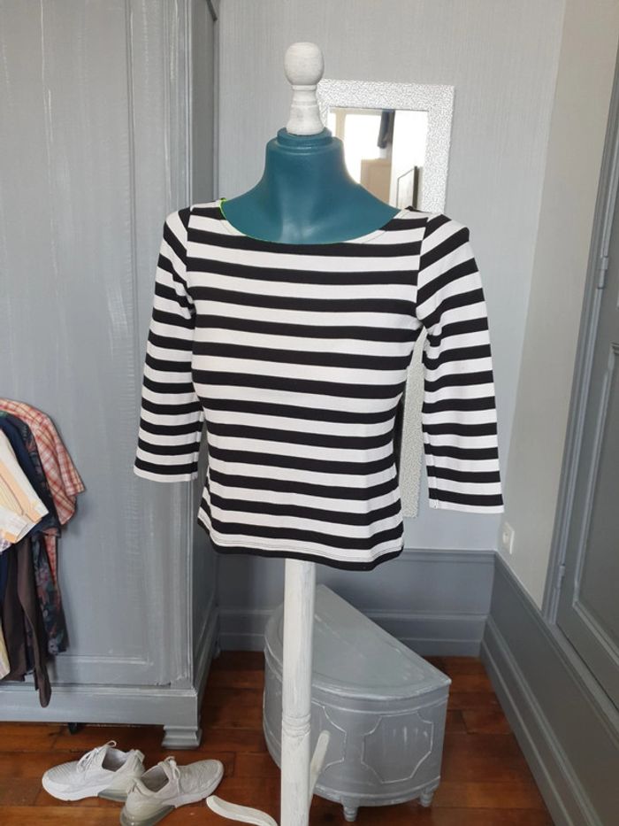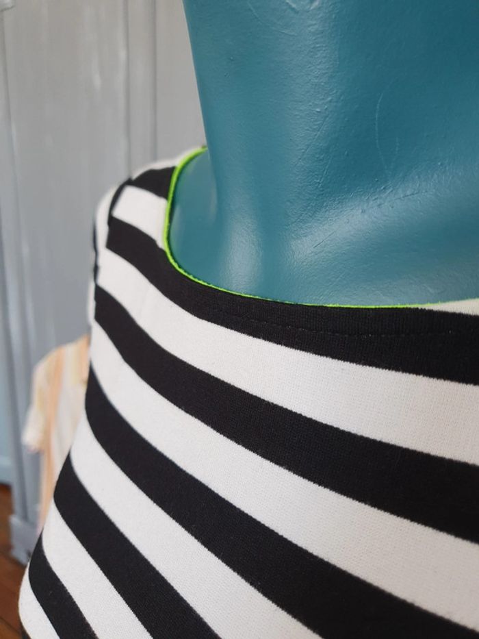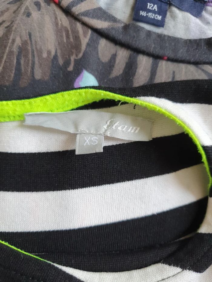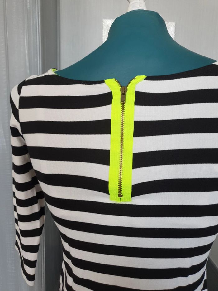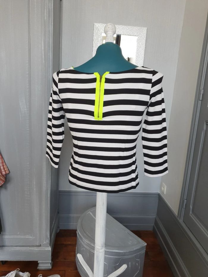 Tee-shirt femme Avec fermeture jaune fluo De marque etam De taille XS A rayures Noir et blanc Manches 3/4 En très bon état Les réductions sont activées sur les lots