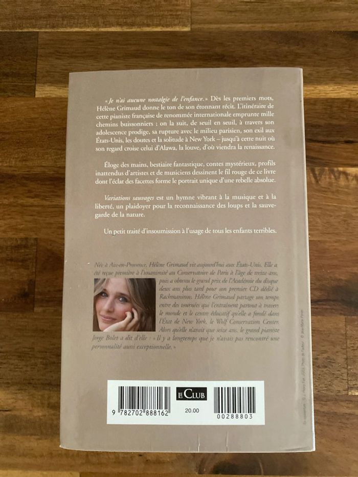 Titre du livre : Variations sauvages Auteur : Hélène Grimaud Type : roman en très bon état valeur neuf 20€