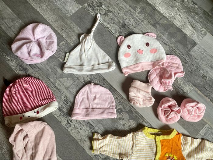 Un petit lot de vêtements de taille naissance comprenant - un gilet rose - un pyjama orange jaune - 5 petits bonnets - 2 paires de chausson naissance - 1 paire de moufle naissance le tout pour un petit prix lot revendeur #naissance #naissancefille #lotrevendeur #lotrevendeurs