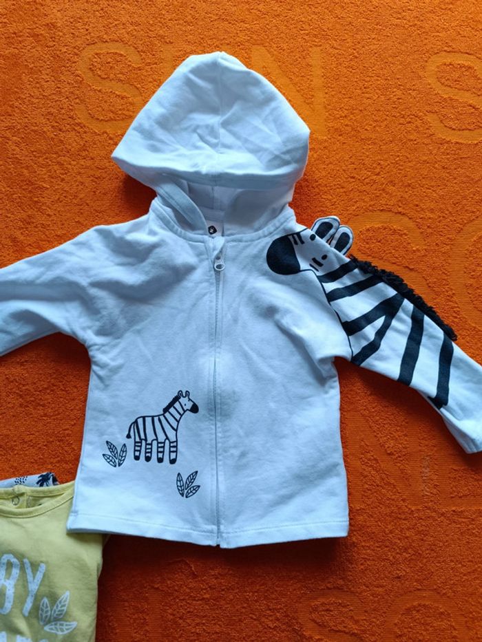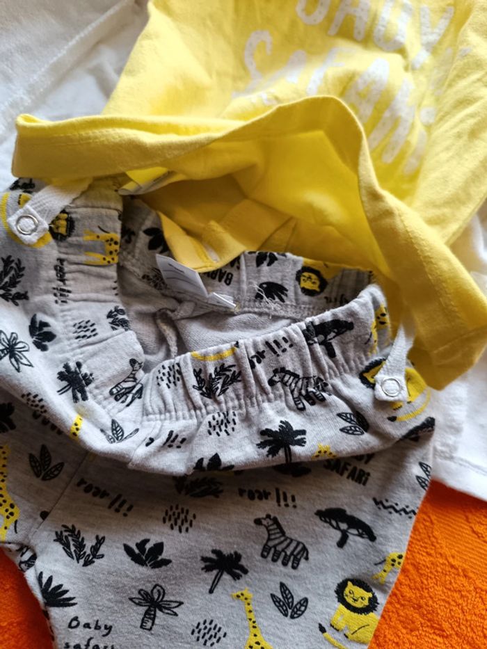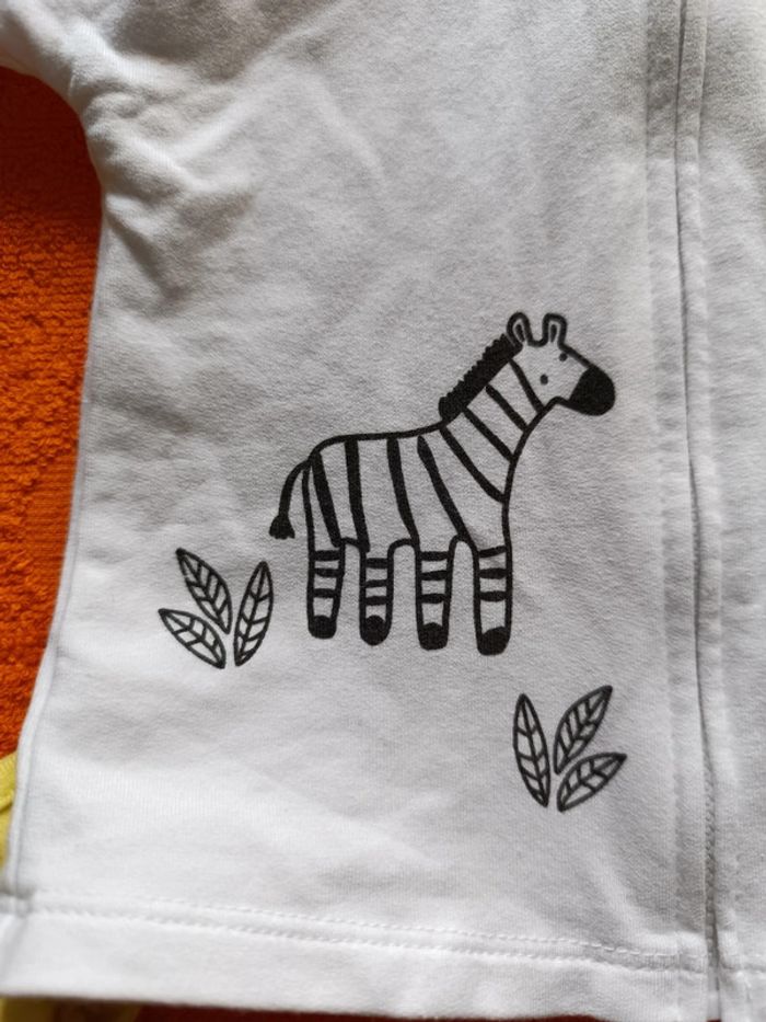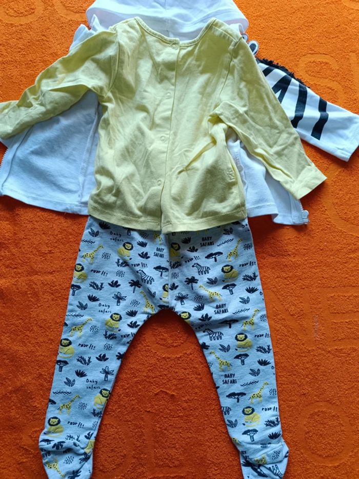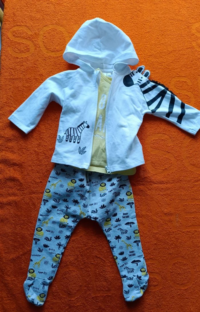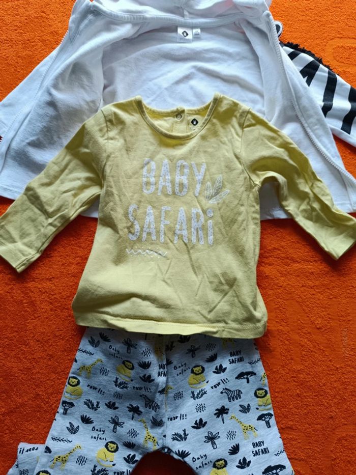 Un ensemble 3 pièces de la marque Z , trop mignon avec un t-shirt manches longues jaune “baby safari” , un gilet blanc à capuche avec deux imprimés zèbre et un pantalon à motif animal