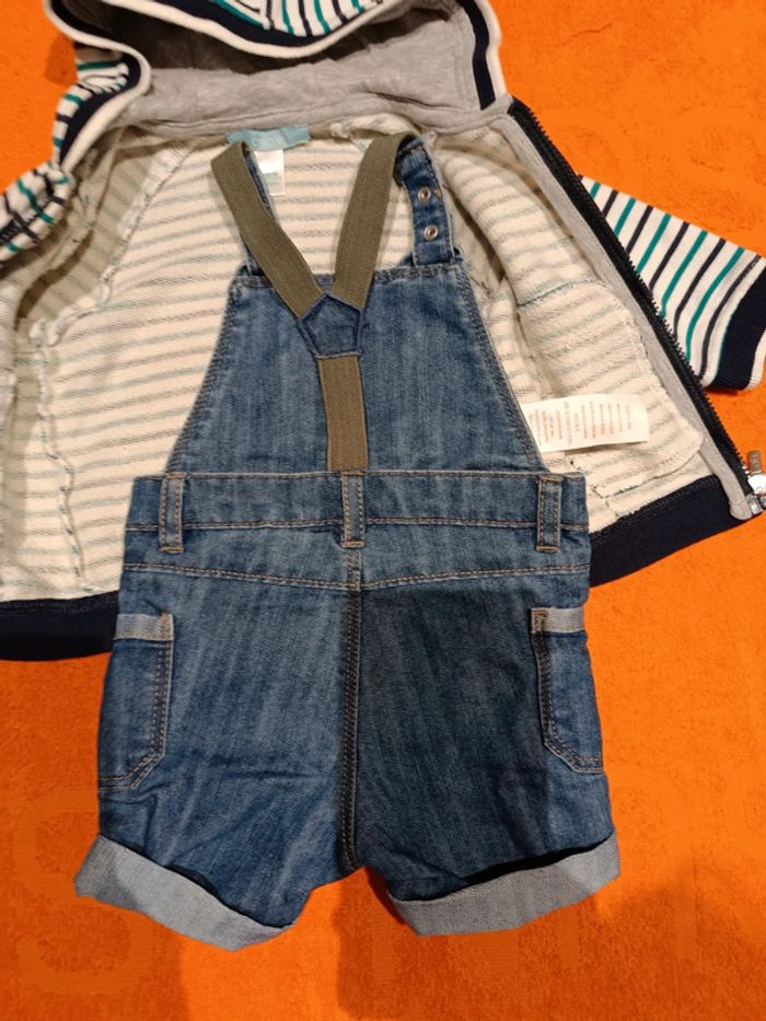 Porté 1 fois, excellent état ❗ juste une mini tâche (1 point sur le tee-shirt, voir photos)❗ Salopette short en jean, tee-shirt manches courtes + sweat zippé à capuche 💡N'hésitez pas à faire un lot pour économiser sur les frais de port et profitez d'une remise automatique🙂🔗 #3moisGarçonCrimstel1