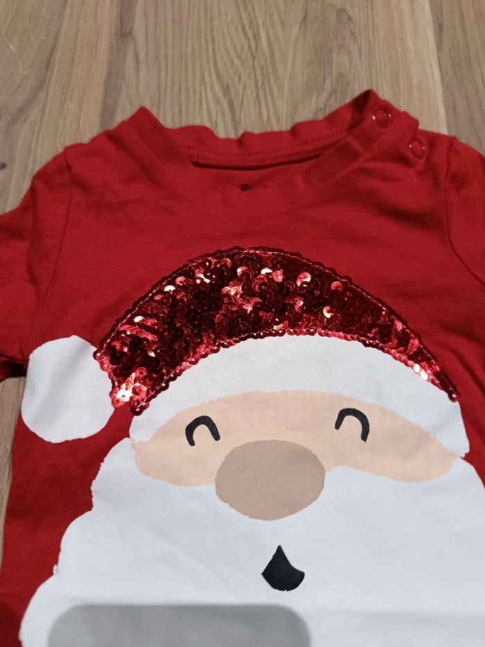 Joli tee-shirt motif Père Noël avec bonnet brillant à sequins Porté quelques fois 💡Pour retrouver les vêtements de la même taille et profiter des réductions de lot, cliquer sur le lien ci-dessous🔗 #3moisGarçonCrimstel1 #3moisfilleCrimstel1