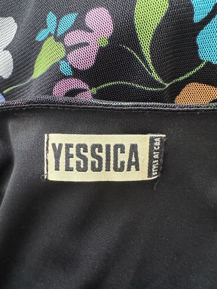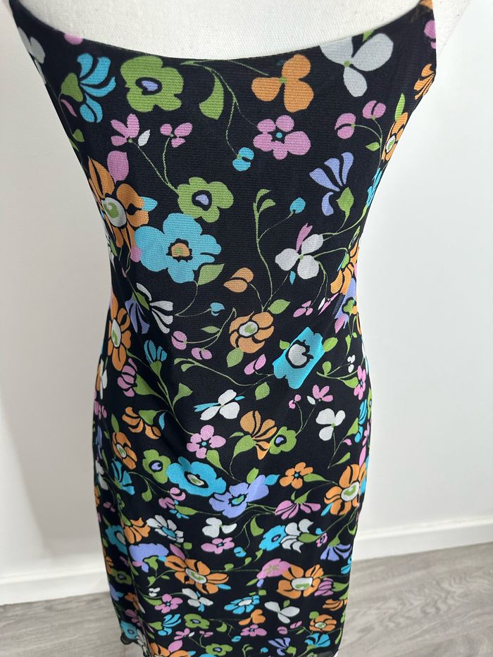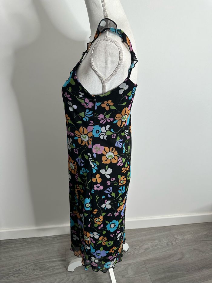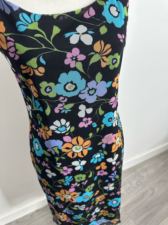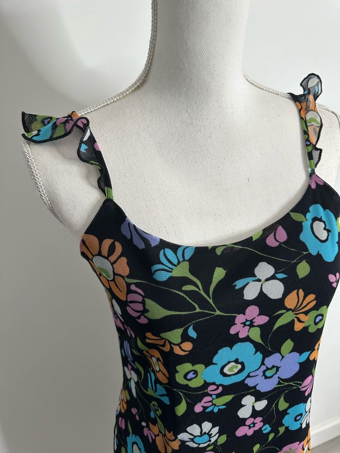 Robe à fleurs - Excellent état - Taille 42 équivalent XL - Yessica, C&A - Style Y2K seventies, années 2000’ - Noire et multicolore - Imprimés fleurs - Doublure intérieure - Fines bretelles avec volant - Tissus mesh - 100% Polyester #seventies #flowers #flower #flowerpower #flowerprint #flowerpattern #flowerprintdress #flowerdesign #flowerdetaildress #mesh #meshdress #y2k #y2kstyle #y2kfashion #y2kaesthetic #y2kvintage #y2kdress
