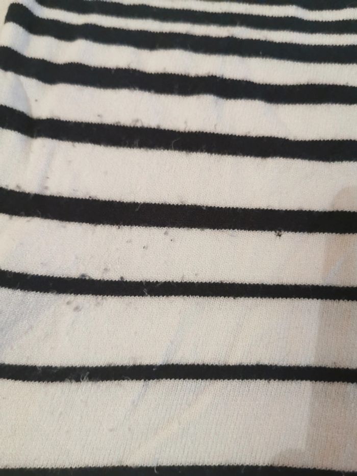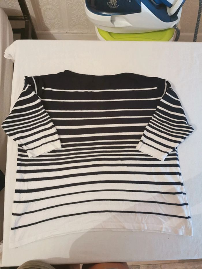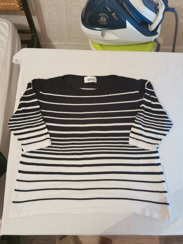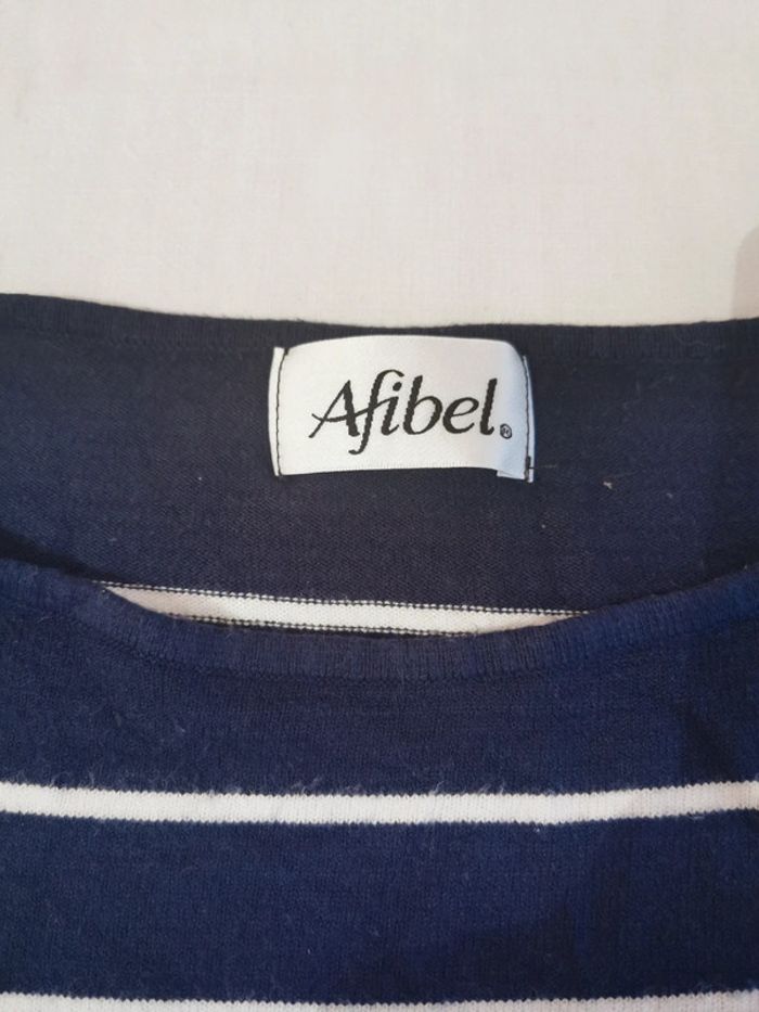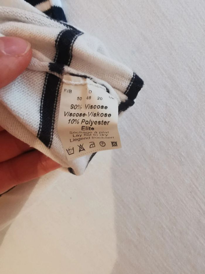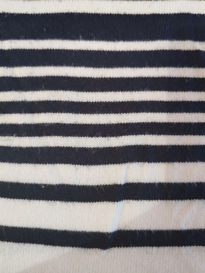 Manches 3/4 Noté taille 50 mais correspond à une taille 44 Noté bon état car matière qui fait beaucoup de peluches (voir photos) Viscose et polyester Bleu marine et blanc