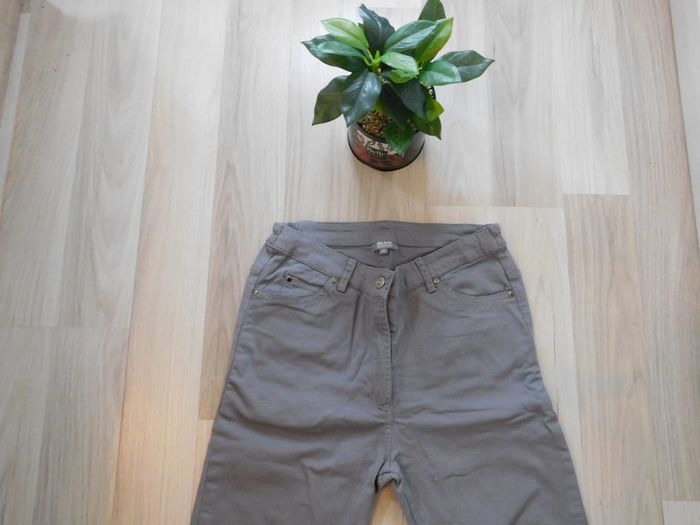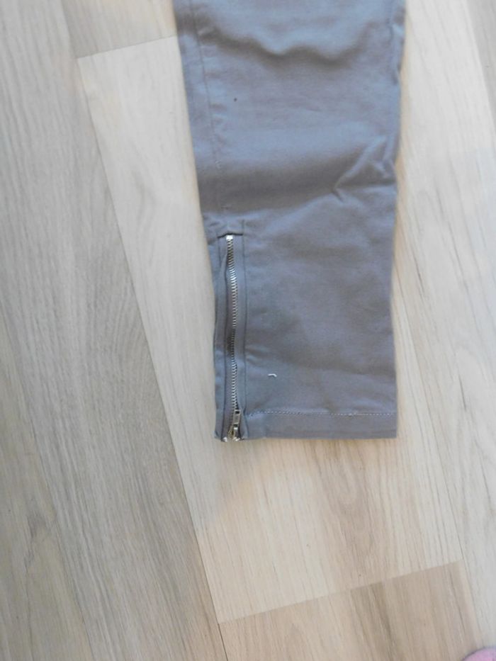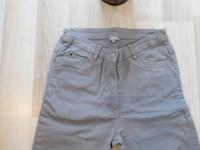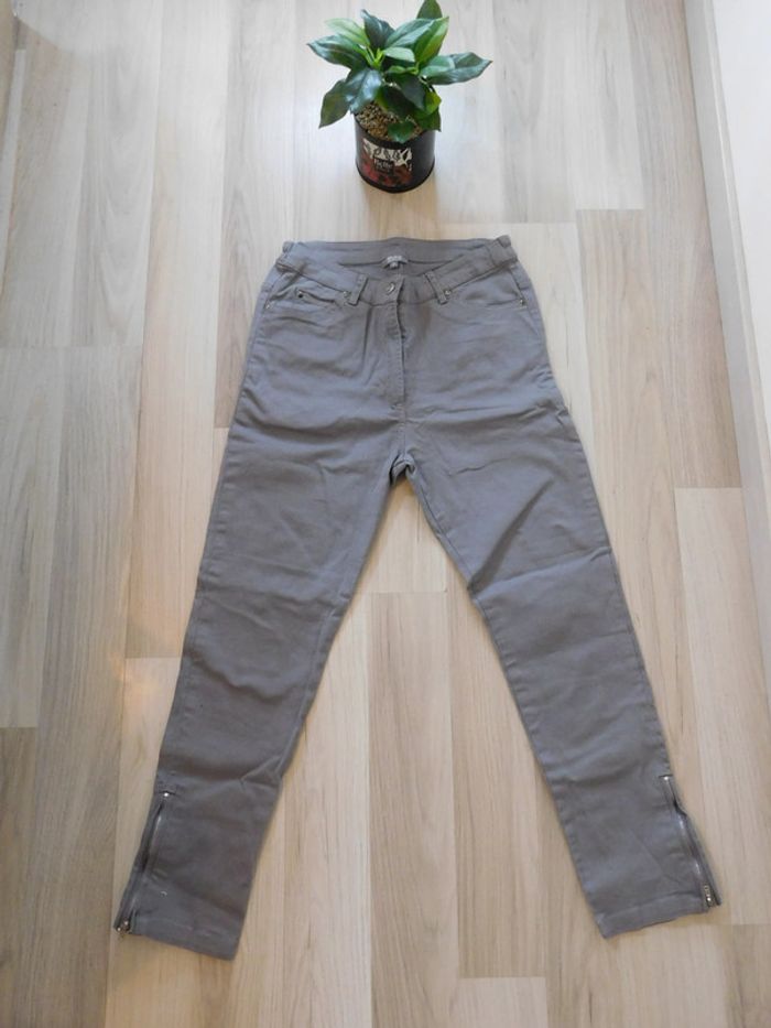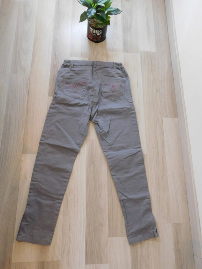 Vend pantalon gris de marque" bleu bonheur" avec fermeture éclaire en bas du pantalon Taille 38 Surpiqûres fuchsia sur les poches arrière Taille élastique au niveau des hanches 98% coton et 2% élasthanne #nananedu17_vêtementsfemme_été_pantalons