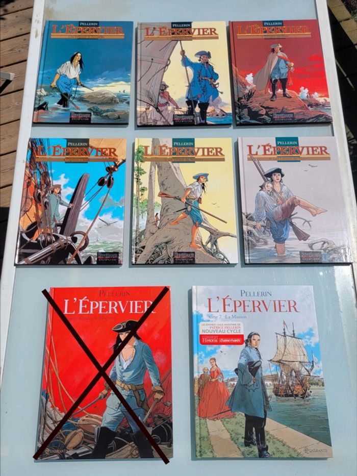 L'ÉPERVIER PELLERIN ÉDITIONS DUPUIS - Tome 1 : Le Trépassé de Kermellec, Août 2001 - Tome 2 : Le Rocher du crâne, mai 2002 - Tome 3 : Tempête sur Brest, Avril 2002 - Tome 4 : Captives à bord, Septembre 2002 - Tome 5 : Le Trésor de Mahury, EO cotée 15€ (BDM) Novembre 2001 - Tome 6 : Les Larmes de Tlaloc, EO cotée 15€ (BDM) Janvier 2005 - Tome 7 : La Mission, EO cotée 15€ (BDM) Mars 2009 Pour voir mes autres BD : #bdmooglou ⚠️ pas d'envoi Chronopsot pour ce lot, uniquement Mondial Relay