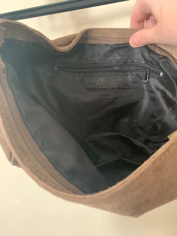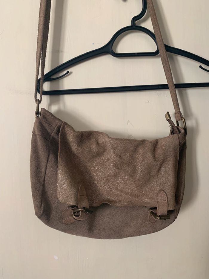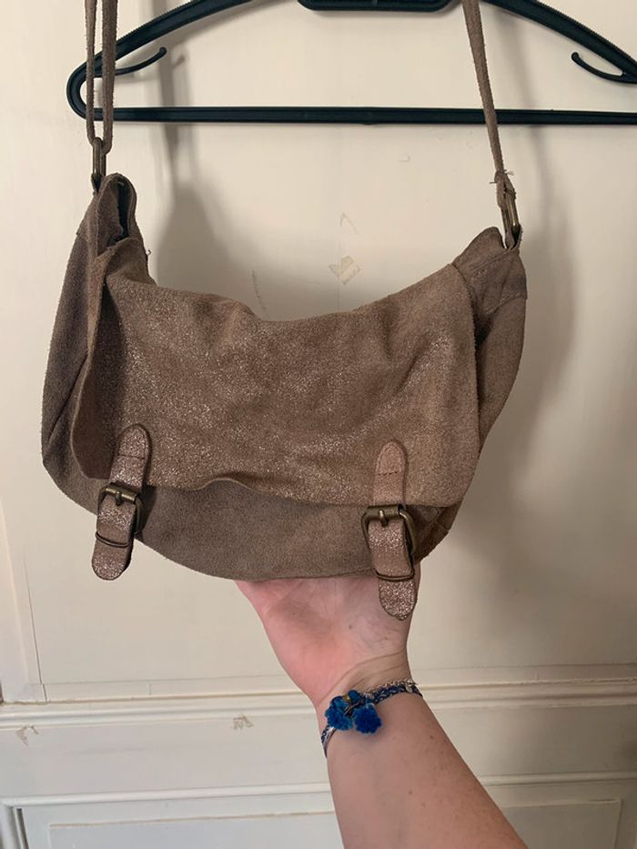 Sac de couleur Camel en cuir souple doublé à l’intérieur, fermeture avec pression. le devant est légèrement brillant cuir véritable.