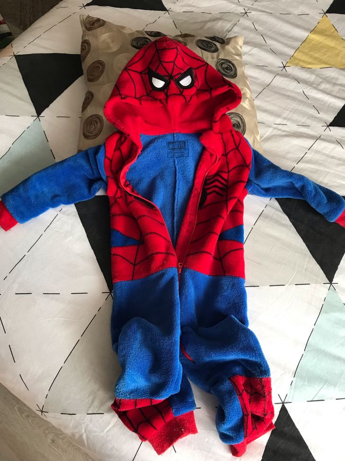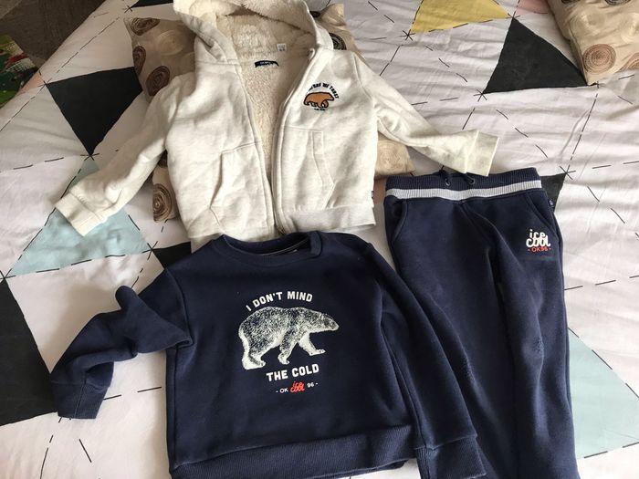 Ensemble de vêtements pour les garçons 1 article : Pull et veste Marque okaidi cercle rouge le nom de l’enfant (Le pantalon n’est pas compter dans le prix parce qu’il est un peu abîmé au niveau du genoux mais je vais l’envoyer quand même si vous êtes intéressés 2 article Combinaison spider man la marque de primark le cercle vert un petit trou Les 2 articles à partir de 2 à 3 ans