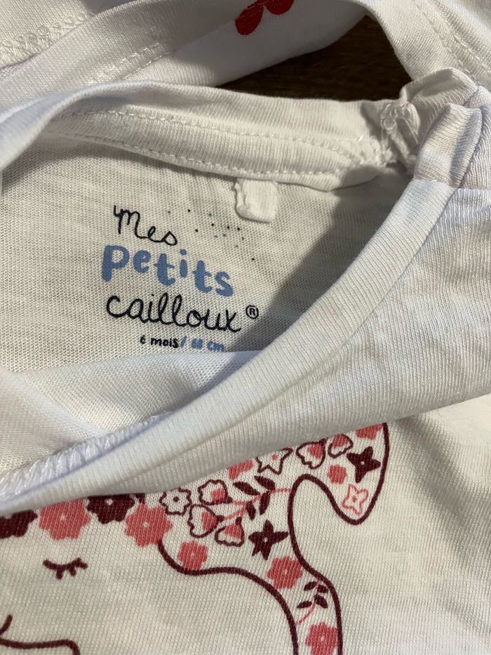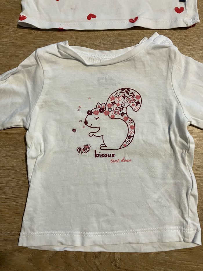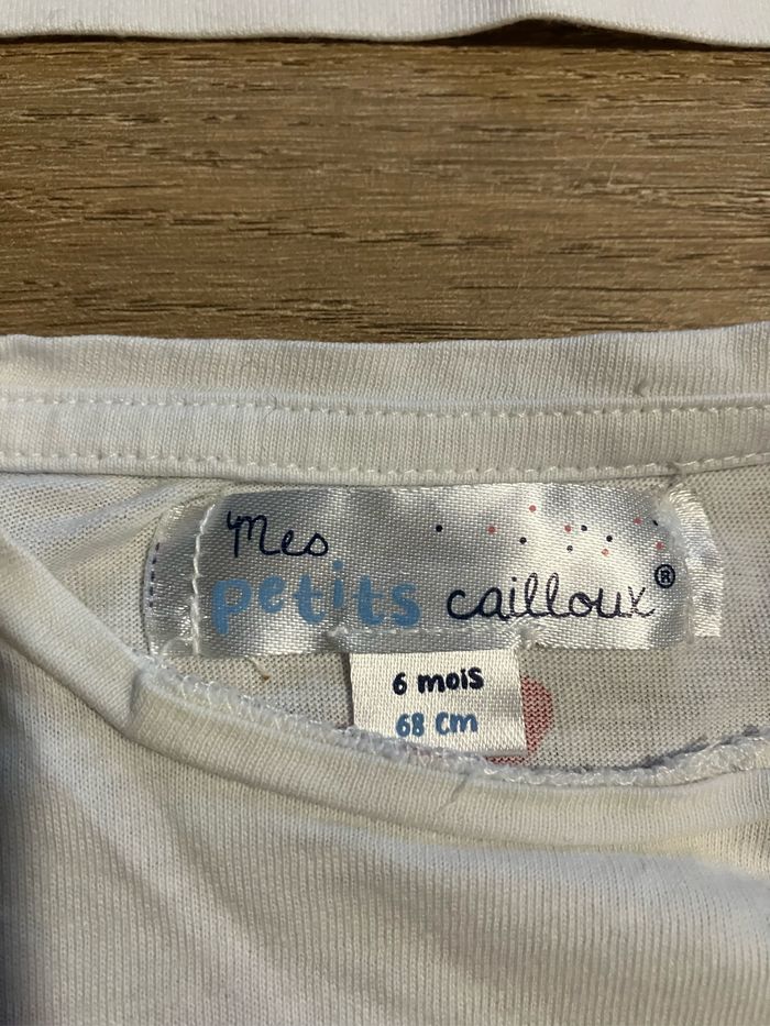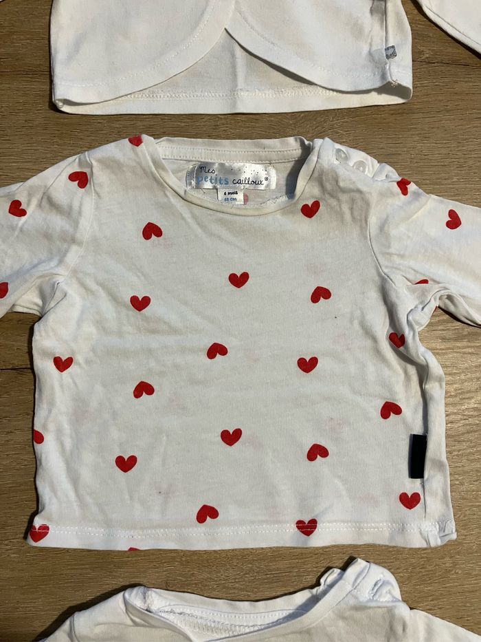 Lot de 2 t-shirts à manches longues Mes Petits Cailloux et 1 gilet boléro Gémo Celui à motifs coeurs est un peu jauni au col (voir 5ème photo) sinon en très bon état Taille 6 mois