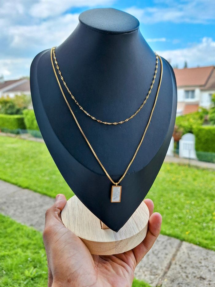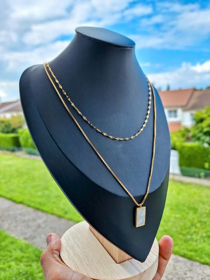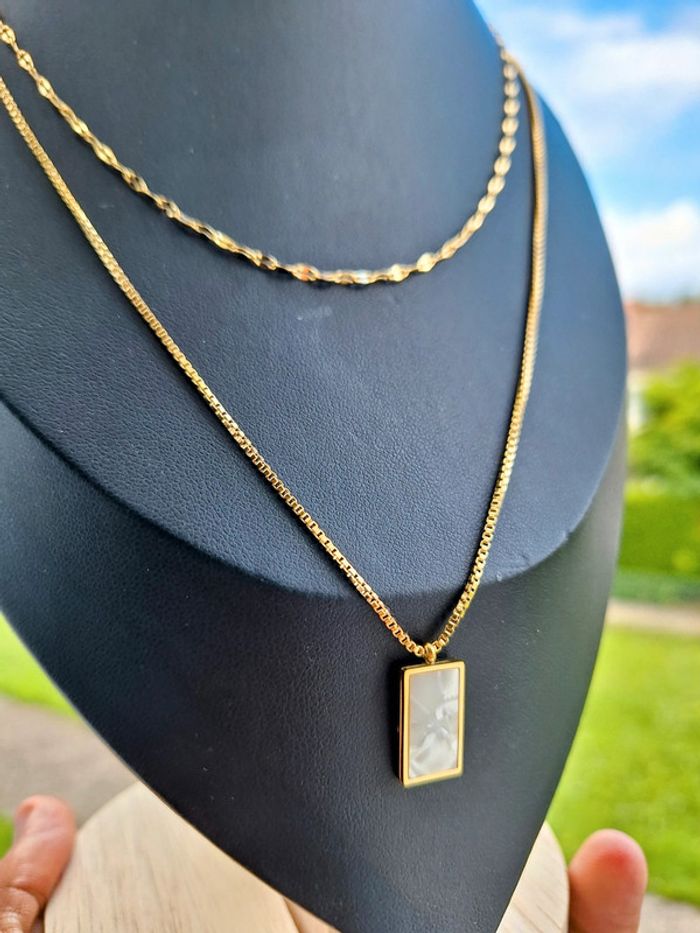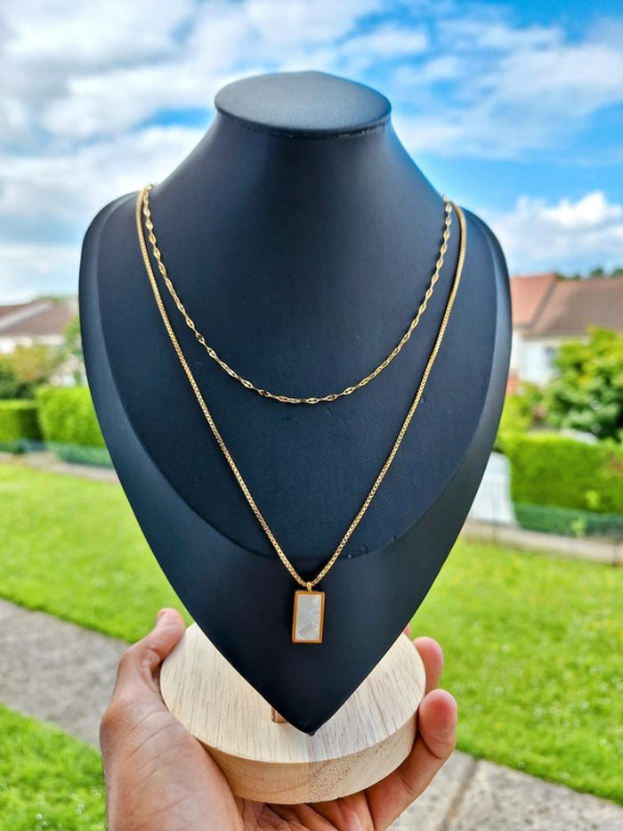 Collier en acier inoxydable double chaine dorée pendentif carré en nacre blanc minimaliste - photo numéro 2