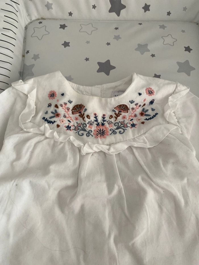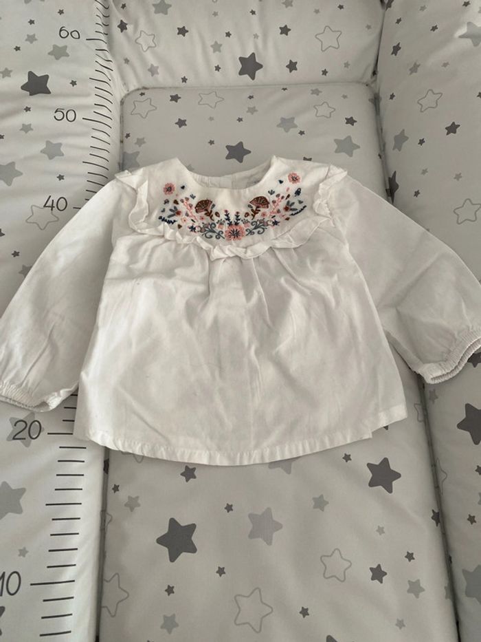 Blouse blanche avec décor brodé bébé fille 6 mois. Excellent état aucune tache. Fermeture boutons au dos. Marque Vertbaudet. 67cm