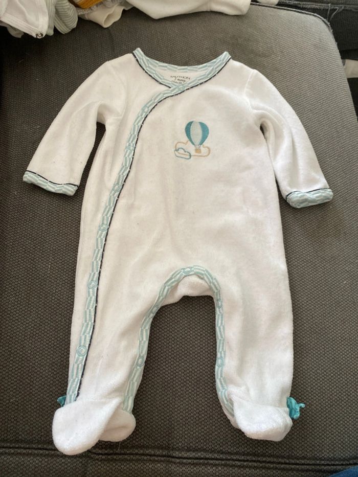 Pyjama Sauthon garçon 3 mois décor montgolfière blanc et bleu ciel. Excellent état. Fermeture sur le côté et à l’entre jambe en boutons pressions.
