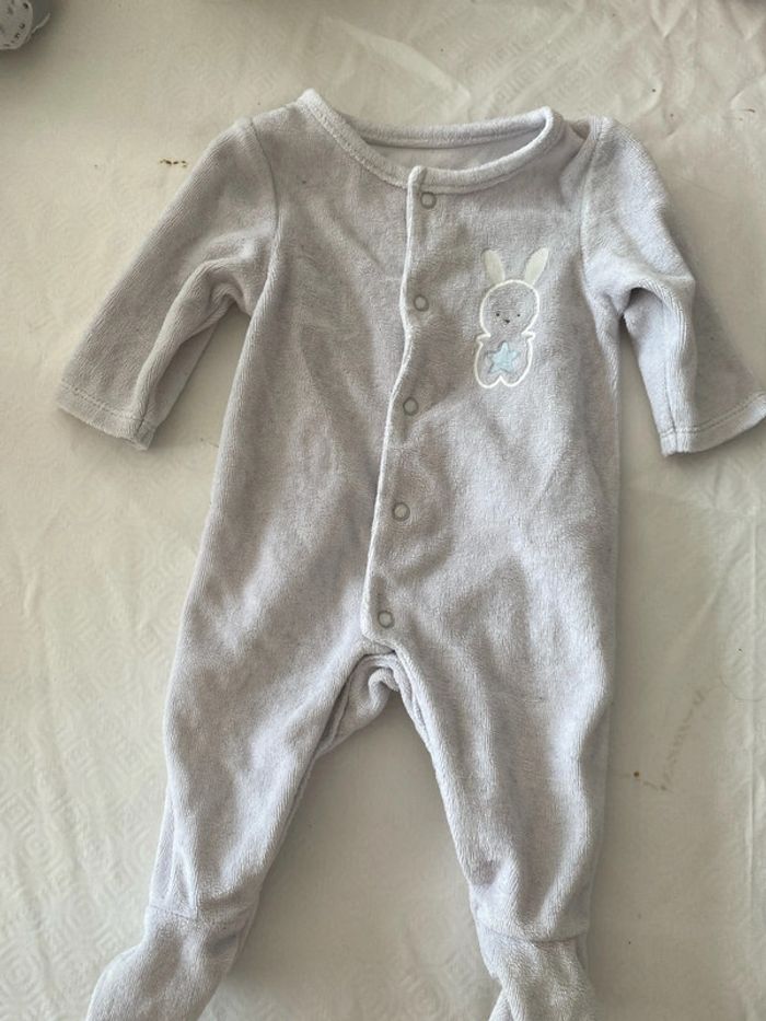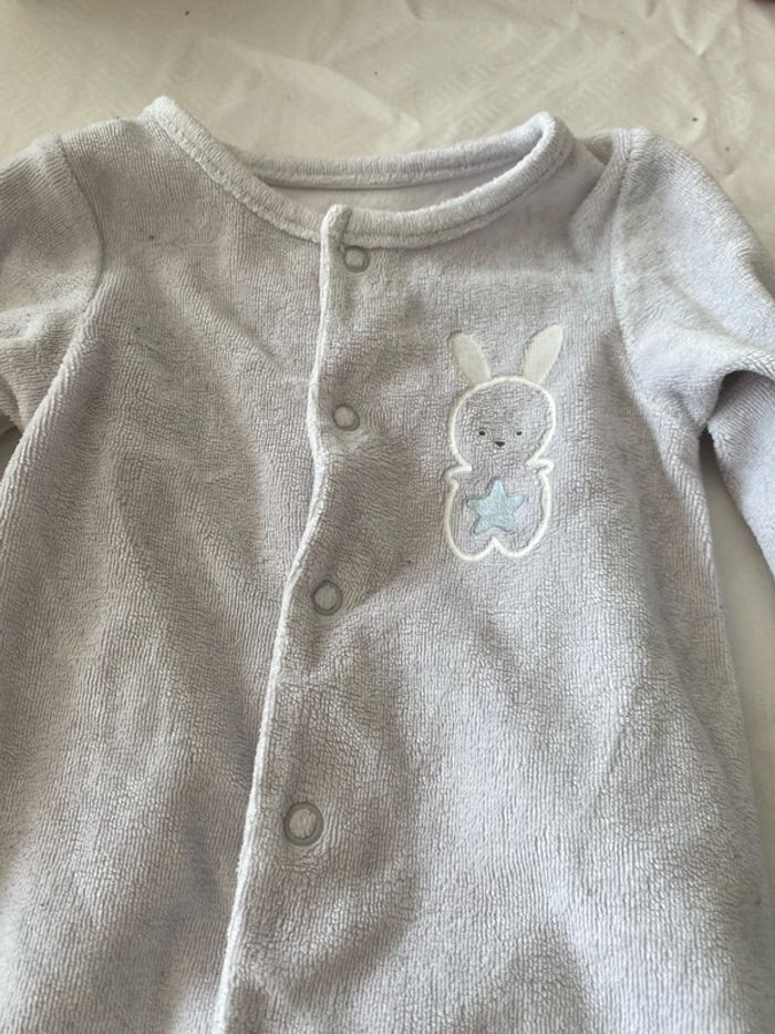 Pyjama bébé 1 mois 53cm gris perle décor lapin. Marque Obaibi. Excellent état. Aucune tache.