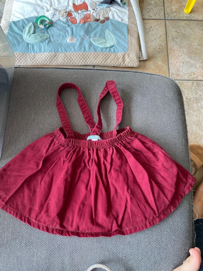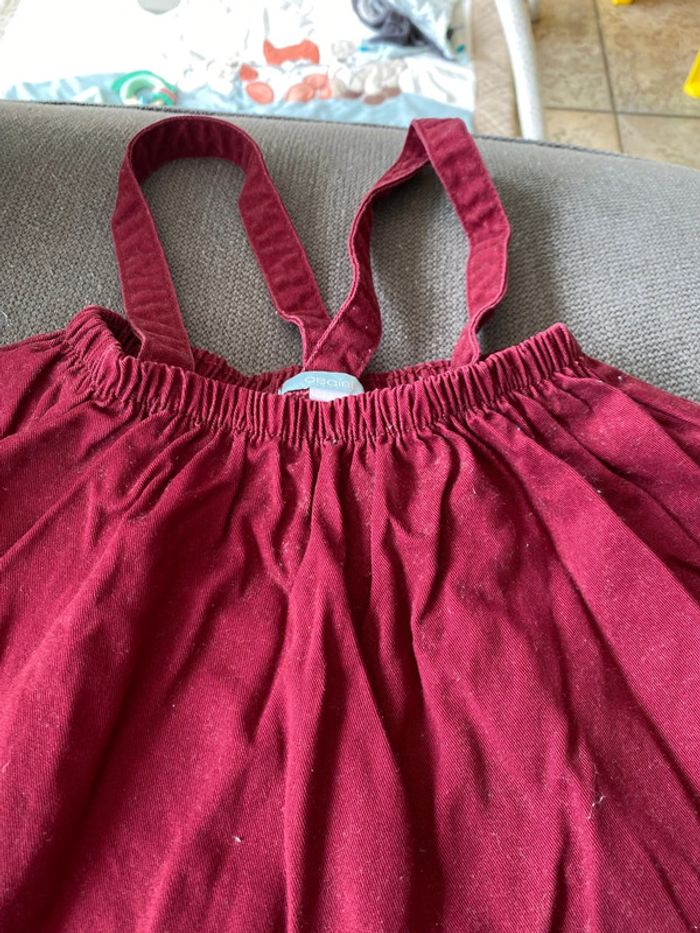 Jupe à bretelles Obaïbi en velours rouge bordeaux, taille 6-12 mois réglable par les bretelles. Jamais porté.