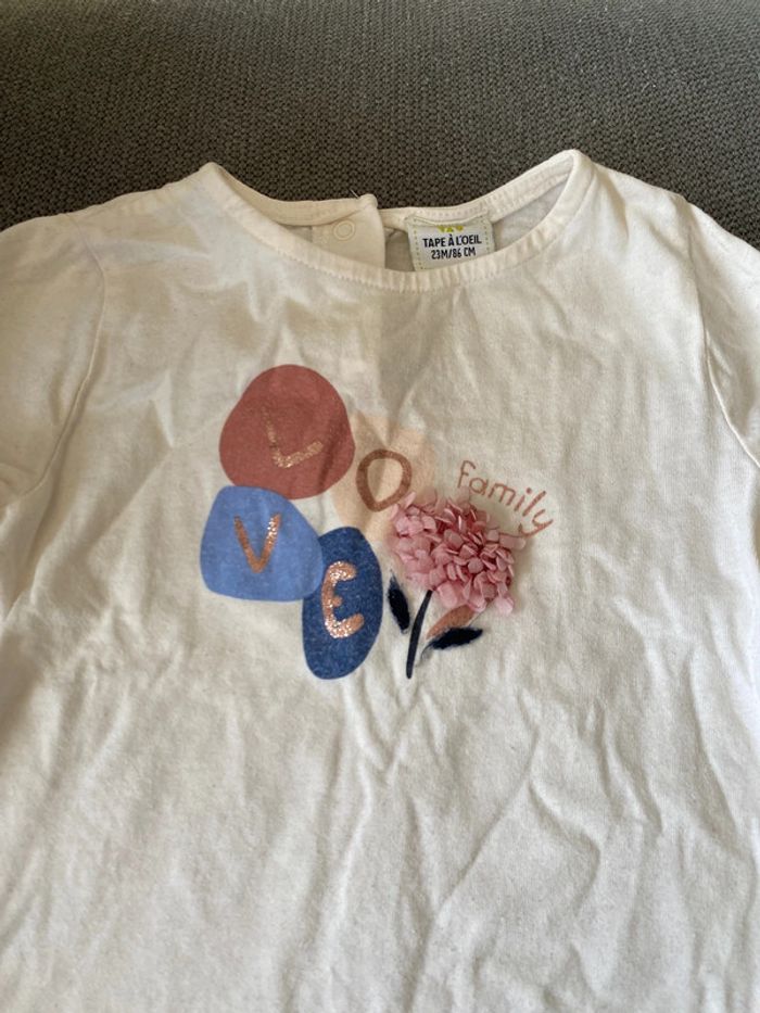 Haut à manches longues fille 23 mois 86cm. marque TAO. Excellent état. Décor « love family » + fleur rose en relief. Couleur blanc.