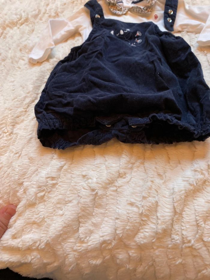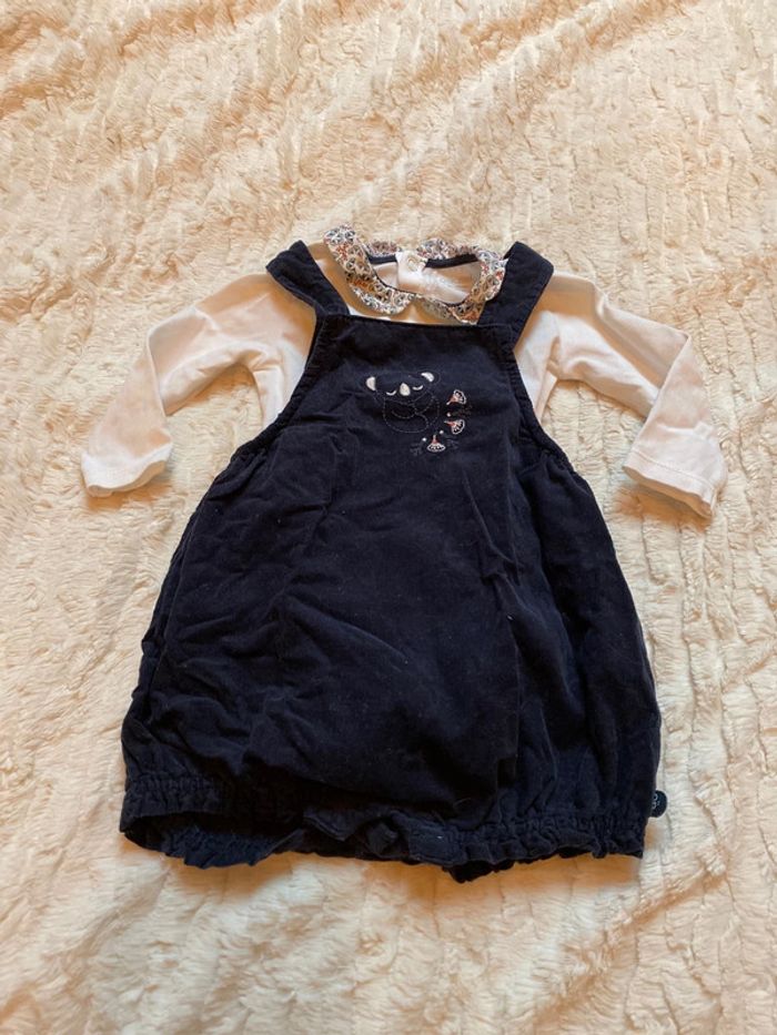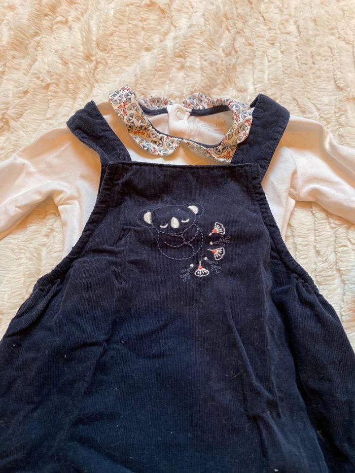 Ensemble bébé fille 6 mois 68 cm marque Obaïbi comprenant un body manches longues blanc avec un col fleuri Claudine (légères taches diffuses jaunes cachées par la combinaison) et la combinaison short réglable par boutons pressions aux épaules et qui peut s’ouvrir au niveau de la couche par boutons pressions bleu marine avec koala. Une de mes tenues préférées pour ma fille. Combinaison en velours.
