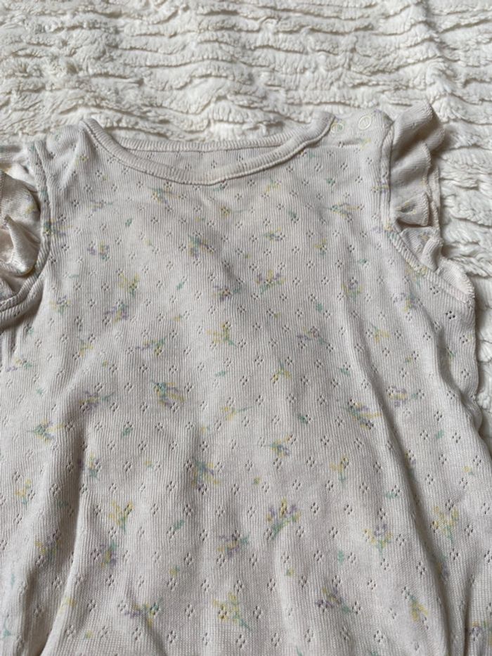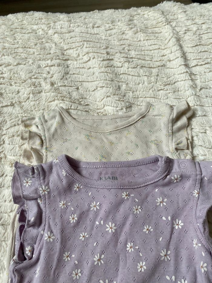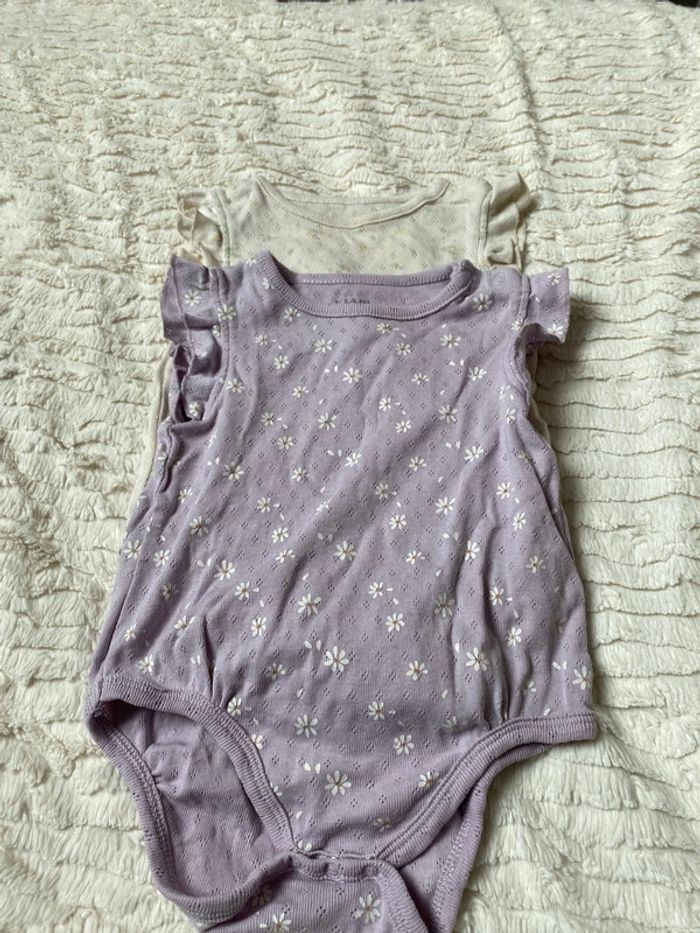 Lot de deux bodies fille taille 9 mois, marqué Kiabi, excellent état, aucune tâche. Tissu coton léger idéal pour le printemps été. Manches courtes avec volants très féminins. L’un est violet avec des petites fleurs blanches et l’autre est crème avec des petites fleurs jaunes.