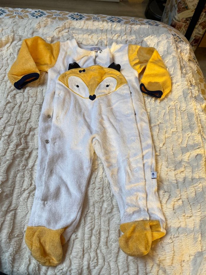Pyjama bébé fille 6 mois 68 cm marque absorba. Fermeture boutons pressions avant avec un petit renard fille en dessin. Une tâche sur l’épaule. Coton velours.