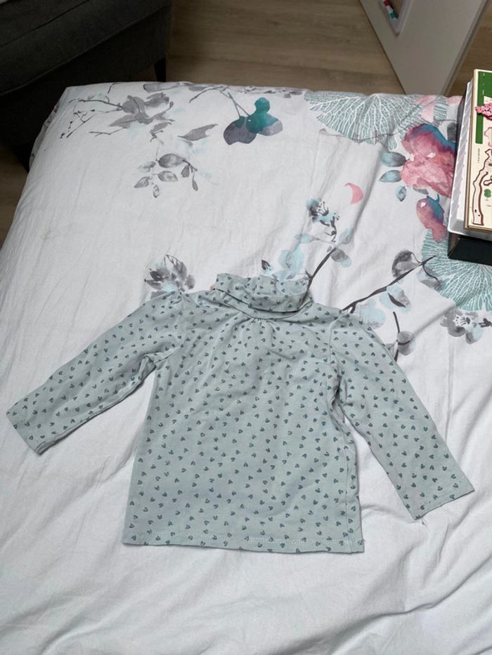 Pull col roulé fille bébé 24 mois taille petit. Marque kiabi. Taille 18-24 mois. Bleu turquoise avec petits cœurs bleu pailletés. Coton super agréable.