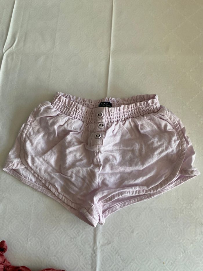 Lot de 2 shorts bébé fille 12 mois marque Kiabi. L’un est mauve et taillé 18 mois mais convient plutôt à un 12 mois. Jamais porté. L’autre est rouge bordeaux à rayures avec un petit noeud à la taille taille 12 mois. Jamais porté également.
