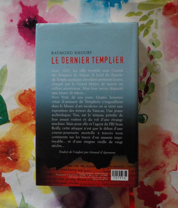 LE DERNIER TEMPLIER de Raymond KHOURY Ed. France Loisirs Bon état Acre, 1291. La ville tremble sous l'assaut des hommes du Sultan. A bord du Faucon du Temple, quelques chevaliers prennent la mer, chargés par le Grand Maître de sauver un coffret mystérieux. Mais leur navire disparaît sans laisser de traces... New York, de nos jours. Quatre hommes vêtus d'armures de Templiers s'engouffrent dans le Musée d'art moderne où se tient une exposition des trésors du Vatican. Une jeune archéologue, Tess, est le témoin pétrifié de leur assaut violent et du vol d'une étrange machine. Mais pour elle et l'agent du FBI Sean Reilly, cette attaque n'est que le début d'une course-poursuite mortelle à travers trois continents sur les traces d'un assassin impitoyable... et d'une énigme vieille de vingt siècles... #martinekrvromans