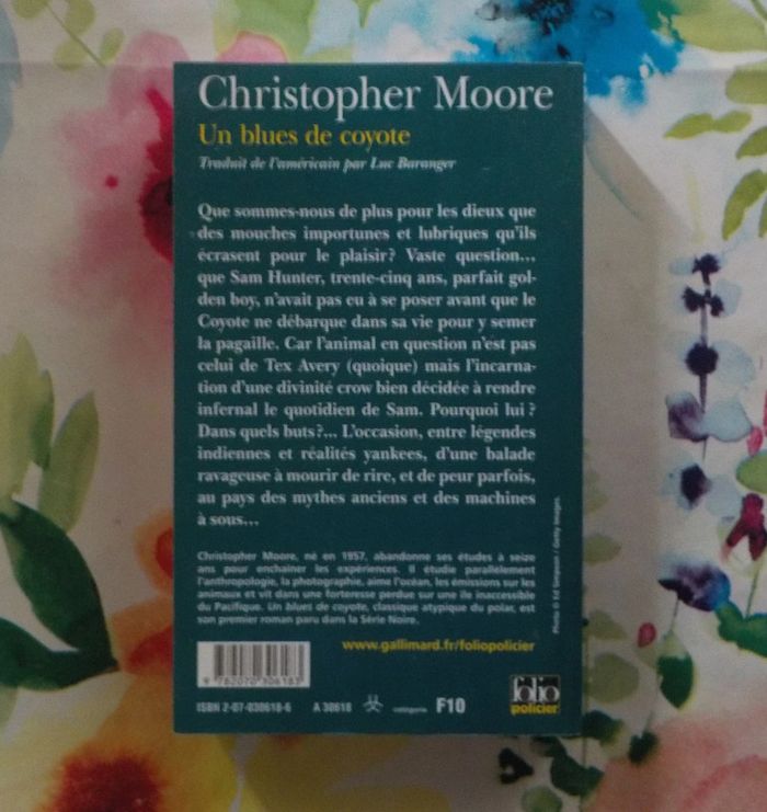 UN BLUES DE COYOTE de Christopher MOORE Ed. Folio Policier Bon état, pages jaunies Que sommes-nous de plus pour les dieux que des mouches importunes et lubriques qu'ils écrasent pour le plaisir ? Vaste question... que Sam Hunter, trente-cinq ans, parfait golden boy, n'avait pas eu à se poser avant que le Coyote ne débarque dans sa vie pour y semer la pagaille. Car l'animal en question n'est pas celui de Tex Avery (quoique), mais l'incarnation d'une divinité crow bien décidée à rendre infernal le quotidien de Sam. Pourquoi lui ? Dans quels buts ?... L'occasion, entre légendes indiennes et réalités yankees, d'une balade ravageuse à mourir de rire, et de peur parfois, au pays des mythes anciens et des machines à sous... #martinekrvthrillers