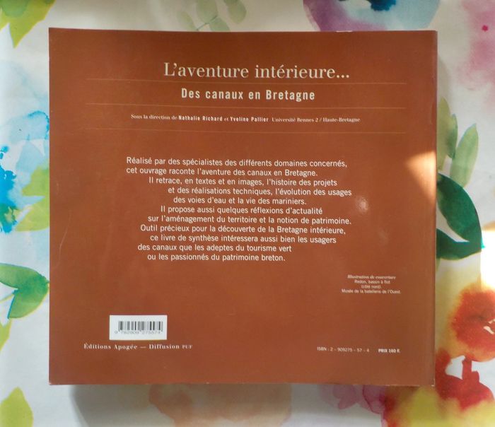 L'AVENTURE INTERIEURE... DES CANAUX EN BRETAGNE sous la direction de Nathalie Richard et Yveline Pallier Ed. Apogée Bon état Réalisé par des spécialistes des différents domaines concernés, cet ouvrage raconte l'aventure des canaux en Bretagne. Il retrace, en textes et en images, l'histoire des projets et des réalisations techniques, l'évolution des usages des voies d'eau et la vie des mariniers. Il propose aussi quelques réflexions d'actualité sur l'aménagement du territoire et la notion de patrimoine. Outil précieux pour la découverte de la Bretagne intérieure, ce livre de synthèse intéressera aussi bien les usagers des canaux que les adeptes du tourisme vert ou les passionnés du patrimoine breton.