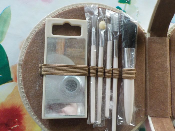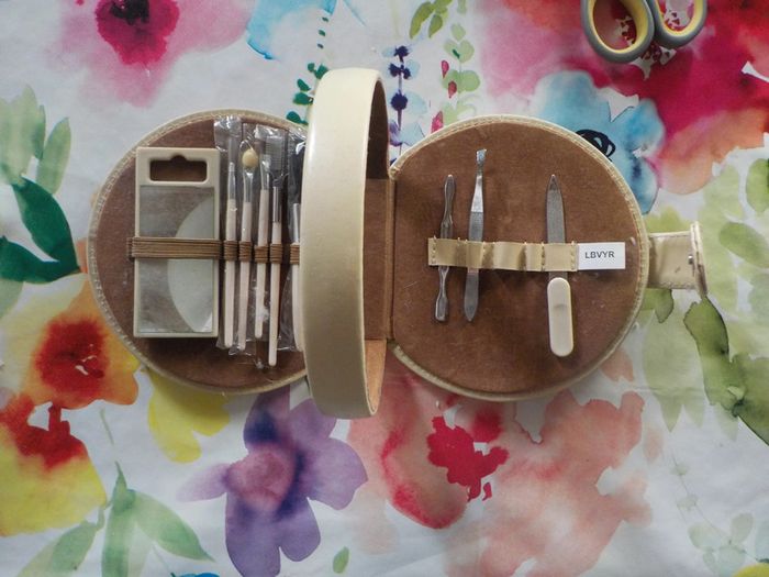 TROUSSE DE MANUCURE Skai beige forme ronde avec une base plate pour la faire tenir debout Très bon état MAIS IL MANQUE LA PAIRE DE CISEAUX ET LE COUPE-ONGLES
