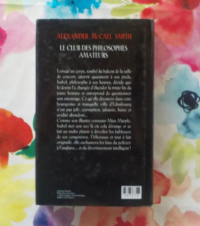 LE CLUB DES PHILOSOPHES AMATEURS de Alexander McCALL SMITH Ed. France Loisirs Bon état Pages jaunies et une inscription effacée au blanco en 3ème page intérieure Lorsqu'un corps, tombé du balcon de la salle de concert, atterrit quasiment à ses pieds, Isabel, philosophe à ses heures, décide que le destin l'a chargée d'élucider la triste fin du jeune homme et entreprend de questionner son entourage. Ce qu'elle découvre dans cette bourgeoise et si tranquille ville d'Edimbourg n'est pas joli : corruption, jalousie, haine et avidité abondent... Comme son illustre consoeur Miss Marple, Isabel met son nez là où cela dérange et se fait un malin plaisir à dévoiler les faiblesses de ses congénères. Délicieuse et tout à fait originale, elle enchantera les fans du policier à l'anglaise... et du divertissement intelligent ! #martinekrvthrillers
