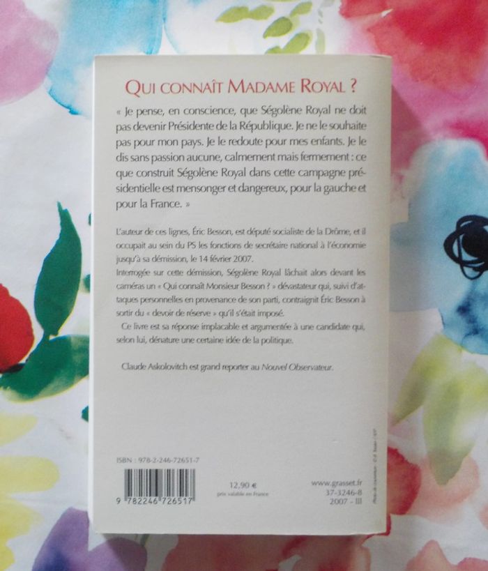 QUI CONNAÎT MADAME ROYAL ? par Eric BESSON Entretien avec Claude Askolovitch Ed. Grasset Bon état « Je pense, en conscience, que Ségolène Royal ne doit pas devenir Présidente de la République. Je ne le souhaite pas pour mon pays. Je le redoute pour mes enfants. Je le dis sans passion aucune, calmement mais fermement : ce que construit Ségolène Royal dans cette campagne présidentielle est mensonger et dangereux, pour la gauche et pour la France. » L’auteur de ces lignes, Eric Besson, est député socialiste de la Drôme, et il occupait au sein du PS les fonctions de secrétaire national à l’économie jusqu’à sa démission le 14 février 2007. Interrogée sur cette démission, Ségolène Royal lâchait alors devant les caméras un « Qui connaît Monsieur Besson ? » dévastateur qui, suivi d’attaques personnelles en provenance de son parti, contraignit Eric Besson à sortir du « devoir de réserve » qu’il s’était imposé. Ce livre est sa réponse implacable et argumentée à une candidate qui, selon lui, dénature une certaine idée de la politique. #martinekrvpolitique