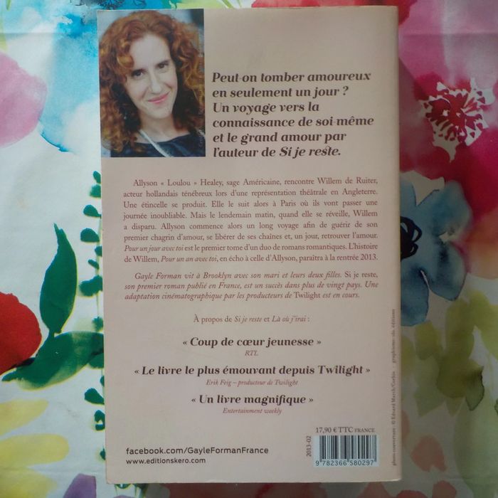 POUR UN JOUR AVEC TOI de Gayle FORMAN Ed. Kéro Bon état " Peut-on tomber amoureux en seulement un jour ? Un voyage vers la connaissance de soi-même et le grand amour par l’auteur de Si je reste. Allyson « Loulou » Healey, sage Américaine, rencontre Willem de Ruiter, acteur hollandais ténébreux lors d’une représentation théâtrale en Angleterre. Une étincelle se produit. Elle le suit alors à Paris où ils vont passer une journée inoubliable. Mais, le lendemain matin, quand elle se réveille, Willem a disparu. Allyson commence alors un long voyage afin de guérir de son premier chagrin d’amour, se libérer de ses chaînes et, un jour, retrouver l’amour. Pour un jour avec toi est le premier tome d’un duo de romans romantiques. L’histoire de Willem, Pour un an avec toi, en écho à celle d’Alysson, paraîtra à la rentrée 2013." #martinekrvromans