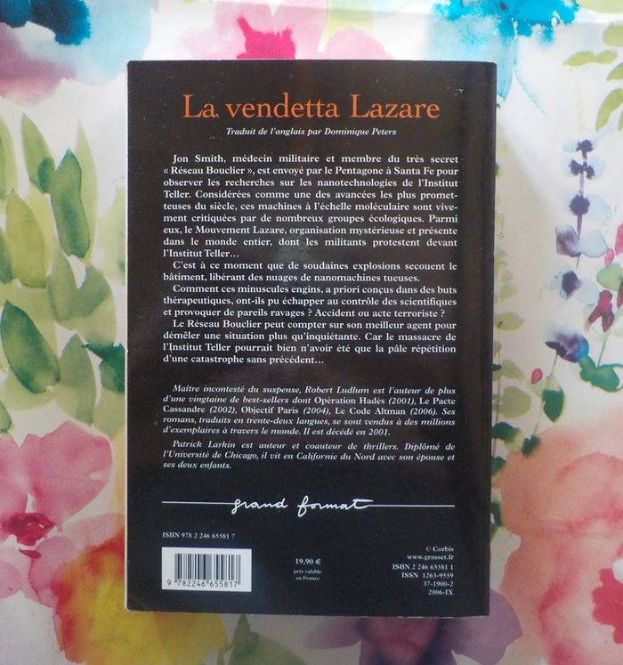 LA VENDETTA LAZARE de Robert LUDLUM et Patrick LARKIN Ed. Grasset Bon état Jon Smith, médecin militaire et membre du très secret « Réseau Bouclier », est envoyé par le Pentagone à Santa Fe pour observer les recherches sur les nanotechnologies de l’Institut Teller. Considérées comme une des avancées les plus prometteuses du siècle, ces machines à l'échelle moléculaire sont vivement critiquées par de nombreux groupes écologiques. Parmi eux, le Mouvement Lazare, organisation mystérieuse et présente dans le monde entier, dont les militants protestent devant institut Teller. C'est à ce moment que de soudaines explosions secouent le bâtiment, libérant des nuages de nanomachines tueuses. Comment ces minuscules engins, a priori conçus dans des buts thérapeutiques, ont-ils pu échapper au contrôle des scientifiques et provoquer de pareils ravages ? Accident ou acte terroriste ? Le Réseau Bouclier peut compter sur son meilleur agent pour démêler une situation plus qu'inquiétante. Car le massacre de l'Institut Teller pourrait bien n'avoir été que la pâle répétition d'une catastrophe sans précédent… #martinekrvthrillers