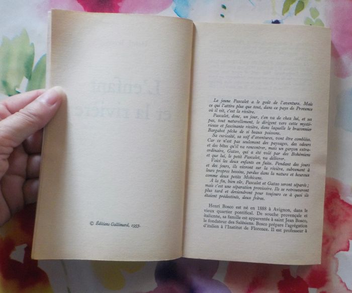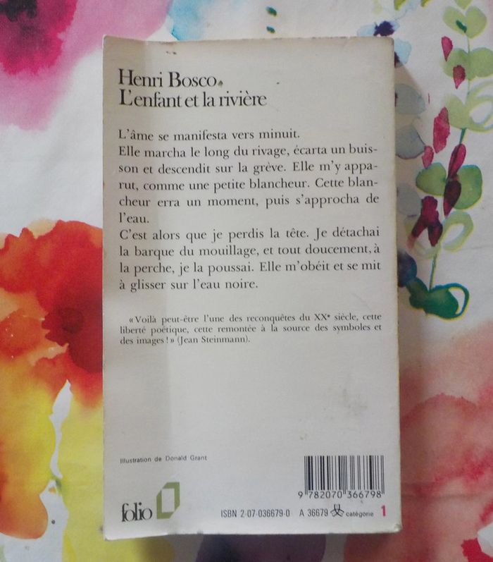 L'ENFANT ET LA RIVIERE de Henri BOSCO Ed. Folio n°679 - 1989 Bon état, pages légèrement jaunies, livre un peu courbé (cf photo) L'âme se manifesta vers minuit. Elle marcha le long du rivage, écarta un buisson et descendit sur la grève. Elle m'y apparut, comme une petite blancheur. Cette blancheur erra un moment, puis s'approcha de l'eau. C'est alors que je perdis la tête. Je détachai la barque du mouillage, et tout doucement, à la perche, je la poussai. Elle m’obéit et se mit à glisser sur l'eau noire. #martinekrvromans