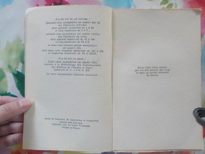 LA FIN DES AMBASSADES de Roger PEYREFITTE Ed. Flammarion 1953 Etat d'usage Bas de la tranche abimé Marques d'humidité (?) sur le tiers du livre (cf photo) Contraint d'abandonner son poste de secrétaire d'ambassade à Athènes, Georges de Sarre choisit d'entrer au service des Oeuvres, véritable havre de grâce au sein du turbulent Quai d'Orsay. Mais l'horizon politique se charge de nuages de plus en plus noirs, 1938 s'achève dans la crainte, 1939 justifie le pessimisme général : la guerre éclate. Replié en Touraine avec ses collègues, Georges de Sarre prête aux événements l'attention amusée d'un spectateur qui se sent, par sa qualité de diplomate, au-dessus du commun des mortels. Il n'en connaîtra pas moins quelques vicissitudes légères en ces heures contrastées qui vont de 1939 à 1945. Au fil de cette satire où rien ni personne n'est épargné, Roger Peyrefitte aiguise ses flèches contre le monde des ambassades qu'il connaît de première main pour y avoir vécu, et le masque dont il pare certains de ses personnages ne laisse pas d'être transparent. #martinekrvromans