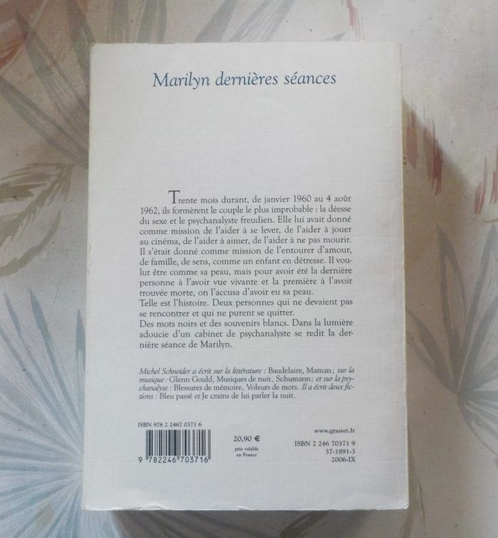 MARILYN DERNIERES SEANCES de Michel SCHNEIDER Ed. Grasset Bon état Trente mois durant, de janvier 1960 au 4 août 1962, ils formèrent le couple le plus improbable : la déesse du se*e et le psychanalyste freudien. Elle lui avait donné comme mission de l'aider à se lever, de l'aider à jouer au cinéma, de l'aider à aimer, de l'aider à ne pas mourir. Il s'était donné comme mission de l'entourer d'amour, de famille, de sens, comme un enfant en détresse. Il voulut être comme sa peau, mais pour avoir été la dernière personne à l'avoir vue vivante et la première à l'avoir trouvée morte, on l'accusa d'avoir eu sa peau. Telle est l'histoire. Deux personnes qui ne devaient pas se rencontrer et qui ne purent se quitter. Des mots noirs et des souvenirs blancs. Dans la lumière adoucie d'un cabinet de psychanalyse se redit la dernière séance de Marilyn. #martinekrvromans